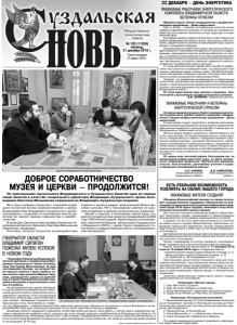 Газета основана 21 марта 1918 г. № 102 (11955) пятница, 21 декабря 2018 г. Общественно политическая газета Объявлен Всероссийский конкурс на право получения государственной поддержки победителям на реализацию лучших проектов создания комфортной городской среды 2019 года в городах, имеющих статус исторических поселений и малых городов. Для участия в конкурсе необходимо выбрать общественные территории города, нуждающиеся в первоочередном благоустройстве путем приема предложений от жителей. У каждого из нас есть реальная возможноcть повлиять на облик нашего города! Общественные территории, набравшие наибольшее количество голосов (предложений), будут благоустроены в 2020 году за счет средств федерального бюджета. Для выбора той или иной общественной территории, всем неравнодушным жителям города предлагаем принять активное участие в голосовании. Проект, победивший по итогам народного голосования, будет направлен для участия во Всероссийском конкурсе. Прием предложений организован с 17 декабря 2018 года по 15 января 2019 года в следующих местах: - администрация города Суздаля (Красная площадь, д. 1); - Центр культуры и досуга (Красная площадь, д. 5); - ул. Советская, д. 38 (помещение почты). Проголосовать можно путем опускания в урну для голосования бюллетеней с проставленным знаком напротив общественной территории города Суздаля, которую, по мнению голосующего, необходимо благоустроить в первую очередь по двум номинациям «Малые города» и «Исторические поселения». Перечень общественных территорий нашего города, представленных на голосование: Номинация «Малые города» 1. Парк 950-летия г.Суздаля. 2. Парк 40-летия Победы, ул.Советская. 3. Улица Михайловская, территория детской площадки. 4. Пруды на ул.Нетека, ул.Лоунская, ул.Коровники. Номинация «Исторические поселения» 1. Пешеходный маршрут от Спасо-Евфимиева монастыря до ул.Покровской, тротуар от Ивановской заставы до Ризоположенского монастыря, окончание благоустройства сквера им. Дм.Пожарского. 2. Городской сад, ул.Кремлевская. 3. Улица Варганова, д. 1, набережная р.Каменка. 4. Улица Пушкарская, набережная р.Каменка. По каждой номинации возможно предложить свой вариант общественной территории. УВАЖАЕМЫЕ ЖИТЕЛИ СУЗДАЛЯ! ЕСТЬ РЕАЛЬНАЯ ВОЗМОЖНОCТЬ ПОВЛИЯТЬ НА ОБЛИК НАШЕГО ГОРОДА Все годы в добром соседстве с епархией музейщики постигали истину взаимопонимания и добра. Взаимодействие Владимиро-Суздальского музеязаповедника с епархией на протяжении многих десятков лет являло пример содружества и соработничества. В канун Дня Святителя Николая Мир Ликийских Чудотворца митрополит Евлогий и Светлана Мельникова обменялись подарками. Разговор касался вопросов взаимодействия епархии и музея в рамках предложенной Министерством культуры РФ и Патриаршим советом по культуре концепции создания согласительных комиссий. Музей и церковь в ближайшее время будут совместно трудиться над проектом празднования в 2024 году 1000-летия Суздаля. Идею епархии канонизировать святителя Илариона, митрополита Суздальского и Юрьевского (XVII в.), музей горячо поддержал и готов помочь в предоставлении научно-исследовательских материалов. ДОБРОЕ СОРАБОТНИЧЕСТВО МУЗЕЯ И ЦЕРКВИ – ПРОДОЛЖИТСЯ! По приглашению митрополита Владимирского и Суздальского Евлогия один из первых своих визитов в качестве генерального директора Владимиро-