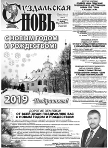Газета основана 21 марта 1918 г. № 104 (11957) пятница, 28 декабря 2018 г. Общественно политическая газета Мы ждем этот праздник с радостью, надеждой и волнением, верим в самое доброе. Встречая Новый год в кругу родных и близких, мы подводим итоги, радуемся успехам и достижениям, строим планы на будущее. Второе десятилетие наша общественная организация «Милосердие и порядок» ведет социально значимые проекты на благо жителей Владимирской области. В 2018 году мы расширили географию проекта «Передвижные центры здоровья». Сегодня медицинские комплексы принимают граждан во всех районах региона. За три года бесплатные обследования прошли более 131 000 жителей нашей области. Более 500 000 человек посетили единственный в России бесплатный кинотеатр. Свыше 850 000 владимирцев и гостей города побывали в уникальном музее-кафе «Гжель». Продолжают работать семейная парикмахерская, бесплатные детские спортивные центры. Впереди у нас много планов! В новом году мы продолжим развивать важные социальные проекты. Желаю всем крепкого здоровья, семейного благополучия, мира и добра! Пусть в каждом доме царят счастье, любовь и взаимопонимание! С ПРАЗДНИКОМ! С уважением, депутат Государственной Думы РФ, председатель ВПОО «Милосердие и порядок» Григорий Викторович АНИКЕЕВ. ДОРОГИЕ ЗЕМЛЯКИ! ОТ ВСЕЙ ДУШИ ПОЗДРАВЛЯЮ ВАС С НОВЫМ ГОДОМ И РОЖДЕСТВОМ! ДОРОГИЕ ЗЕМЛЯКИ! ПРИМИТЕ НАШИ СЕРДЕЧНЫЕ ПОЗДРАВЛЕНИЯ С НАСТУПАЮЩИМ НОВЫМ 2019 ГОДОМ И РОЖДЕСТВОМ! В преддверии этих праздников мы неизменно надеемся, что главные победы, встречи и достижения ещё впереди. Они пробуждают в наших сердцах самые смелые надежды и устремления, мобилизуют нашу энергию на новые добрые дела. Вся страна, а вместе с ней и Владимирская область, вступает в эпоху глубоких перемен. Грандиозные задачи, поставленные главой государства, продиктованы вызовами времени. От наших сегодняшних успехов будет зависеть, какое место займёт Россия в стремительно меняющемся мире, кем себя будет чувствовать каждый её гражданин, какими достижениями и планами будет жить следующее поколение россиян. Уважаемые жители Владимирской области! Желаем вам в наступающем 2019 году выполнения самых амбициозных замыслов, крепкого здоровья, семейного счастья и благополучия, душевного тепла и мира. С Новым годом! С Рождеством! В.В. СИПЯГИН, Губернатор Владимирской области. В.Н. КИСЕЛЁВ, председатель Законодательного Собрания Владимирской области. С.С. МАМЕЕВ, Главный федеральный инспектор по Владимирской области. УВАЖАЕМЫЕ ЖИТЕЛИ СУЗДАЛЬСКОГО РАЙОНА! ДОРОГИЕ ДРУЗЬЯ! ПРИМИТЕ САМЫЕ ТЁПЛЫЕ ПОЗДРАВЛЕНИЯ С НОВЫМ ГОДОМ И РОЖДЕСТВОМ ХРИСТОВЫМ! Это одни из самых светлых и долгожданных семейных праздников. Они проникнуты атмосферой доброты, душевного тепла, домашнего уюта, и, конечно, верой в то, что самые заветные желания непременно сбудутся. Новый год – это не просто смена дат в календаре. Это время, когда принято подводить итоги, осмысливать пережитое, строить планы на будущее. 2018 год запомнится нам не только напряженной работой, но и радостными моментами, важными событиями. Уходящий год мы завершаем с достойными результатами и в этом есть заслуга каждого жителя нашего района. Мы вместе шли к намеченным целям, вместе работали на благо нашей малой Родины. Каким будет наступающий год – зависит только от нас с вами, от нашей целеустремленности, 