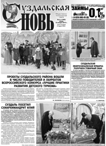 Газета основана 21 марта 1918 г. № 3 (11960) среда, 16 января 2019 г. Общественно политическая газета СУЗДАЛЬСКАЯ ЕВФРОСИНЬЕВСКАЯ ЯРМАРКА ПОЛУЧИЛА ТОВАРНЫЙ ЗНАК В конце декабря в Торгово-промышленной палате Владимирской области состоялось заседание по подведению итогов деятельности палаты за 2018 год. В рамках мероприятия Президент Торгово-промышленной палаты области Иван Аксёнов вручил Главе администрации Суздальского района Алексею Сараеву свидетельство о регистрации товарного знака "Суздальская Евфросиньевская ярмарка". Этот товарный знак был разработан в 2007 году совместно с Суздальским филиалом федерального государственного бюджетного образовательного учреждения высшего профессионального образования «Санкт-Петербургский государственный университет культуры и искусств» и использовался на протяжении 11 лет при проведении ярмарки. На логотипе изображены торговцы на фоне Торговых рядов г. Суздаля. Решение о регистрации товарного знака «Суздальская Евфросиньевская ярмарка» было принято администрацией района в 2017 году. Тогда же администрация района обратилась в Торгово-промышленную палату с просьбой провести процедуру регистрации комбинированного товарного знака «Суздальская Евфросиньевская ярмарка» в Государственном реестре товарных знаков. Почти год длилась процедура согласования товарного знака в различных инстанциях. Теперь администрация района является его правообладателем, а товарный знак планируется использовать в качестве бренда мероприятия. О. СМИРНОВ. Проекты Суздальского района вошли в число победителей и лауреатов Всероссийского конкурса «Лучшие практики развития детского туризма», организованного Торгово-промышленной палатой России, Российским государственным университетом туризма и сервиса и информационно-аналитическим порталом ВГТРК «Вести.ру». На конкурс было подано почти 250 заявок из 36 регионов РФ и 75 городов и сельских поселений. Заявки и презентационные альбомы оценивало жюри в составе ведущих научных сотрудников РГУТИС, а также известных деятелей сферы детского туризма и отдыха. Суздальский район представляли два проекта: «Усадьба Марьи Искусницы в Суздале» (автор проекта - Ксения Варнавская) и «Изба у Митрофановны» с. Спасское Городище (автор проекта - Татьяна Кинеева). По итогам конкурса «Усадьба Марьи Искусницы в Суздале» признана победителем в номинации «Лучшая программа детского туризма в малых городах», а проект «Изба у Митрофановны» стал лауреатом конкурса в номинации «Лучшие практики детского туризма в сельской местности». Поздравляем авторов проектов и желаем им дальнейшего развития! М. ПАХОМОВА. Фото автора. ПРОЕКТЫ СУЗДАЛЬСКОГО РАЙОНА ВОШЛИ В ЧИСЛО ПОБЕДИТЕЛЕЙ И ЛАУРЕАТОВ ВСЕРОССИЙСКОГО КОНКУРСА «ЛУЧШИЕ ПРАКТИКИ РАЗВИТИЯ ДЕТСКОГО ТУРИЗМА» Дети в Усадьбе Марьи Искусницы. Слева - Ксения Варнавская. Иван Аксёнов вручает Алексею Сараеву свидетельство о регистрации товарного знака «Суздальская Евфросиньевская ярмарка». СУЗДАЛЬ ПОСЕТИЛ СХИАРХИМАНДРИТ ИЛИЙ 13 января город Суздаль посетил схиархимандрит Илий (Ноздрин), духовник Патриарха Московского и всея Руси Кирилла и Свято-Введенской Оптиной пустыни. Цель его визита – посещение Спасо-Преображенского собора Спасо-Евфимиева монастыря, Богородице-Рождественского собора Суздальского кремля, храма Успения Божией 