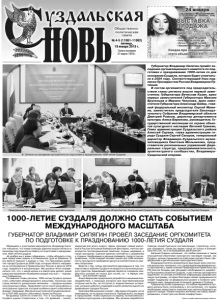 Газета основана 21 марта 1918 г. № 4-5 (11961-11962) пятница, 18 января 2019 г. Общественно политическая газета 24 января гостиница «Молодежная» (г. Суздаль, ул. Ленина, 104) Реклама ИП Панченко Р.М. ОГРНИП 318682000029372 Обращаясь к участникам мероприятия, Владимир Сипягин напомнил, что новая команда администрации области в прошлом году приняла эстафету по подготовке к празднованию 1000-летия Суздаля. «В ноябре мы с вами собирались, чтобы обсудить стоящие перед нами задачи и оптимальные пути их решения. И мы вместе пришли к выводу о том, что Программа развития города Суздаля до 2024 года, которую область направила на согласование в Правительство России в августе 2018 года, нуждается в актуализации. Мы должны чётко определиться: кто, что, с какой целью и в какой срок делает, какие средства привлекает. Выверяем каждый наш шаг», – подчеркнул Губернатор. По мнению главы региона, 1000-летие Суздаля должно стать событием международного масштаба, поскольку сам город является уникальным явлением – городом-музеем под открытым небом. Привлекает сотни тысяч российских и иностранных туристов, которые особенно ценят событийный формат. Например, Масленичные гуляния в Суздале включены в ТОП-200 лучших событийных проектов России. Владимир Сипягин отметил, что в последние годы Суздаль рушил стереотипы о том, что древний – значит, закрытый для всего нового. Здесь проходит самый массовый в России блюзовый байкерский фестиваль, неплохо реализуется гастрономическая тематика: огурцы, медовуха, а также экотуризм. Смелый креатив сочетается с уважением к старине. Необходимо и дальше развивать город в том направлении, чтобы каждый человек нашёл для себя возможность культурного проведения досуга в соответствии со своими запросами. Вместе с тем, члены оргкомитета единодушны в том, что подготовка к юбилею Суздаля не сводится к организации досуга туристов. Важнейшей задачей является создание комфортных условий не только для гостей, но – в первую очередь – для жителей города. Алиса Бирюкова предложила разработать механизм взаимодействия, с помощью которого все заинтересованные стороны могли бы, не отступая от ведомственных интересов, успешно работать командой в целях развития одного из древнейших городов России. Светлана Мельникова считает: «Мы едем в Суздаль не за аквапарком, не на лыжах покататься. Прежде всего, мы едем в город-музей, чтобы окунуться в старину, познакомиться с историко-культурным наследием. Мы должны выработать главную концептуальную составляющую, стратегию, которая определит, каким мы видим город не только в ближайшие пять лет, но и на ближайшие десятилетия». Евгений Гранкин напомнил, что любое решение в таком насыщенном объектами культурного наследия городе, как Суздаль, должно приниматься в жёстком соответствии с федеральным и региональным законодательством. Владимир Сипягин внимательно выслушал всех участников дискуссии, напомнил, что с председателем федерального оргкомитета, заместителем Председателя Правительства РФ Ольгой Голодец уже обсуждал необходимость доработки Программы развития Суздаля, и дал членам оргкомитета поручение: на основе уточнённой информации разработать такую программу, которая благодаря своей продуманности найдёт поддержку на федеральном уровне и позволит реализовать весь грандиозный потенциал древнего Суздаля. Губер