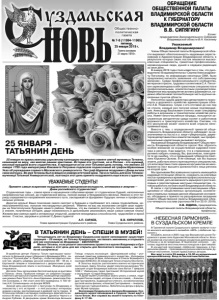 Газета основана 21 марта 1918 г. № 7-8 (11964-11965) пятница, 25 января 2019 г. Общественно политическая газета Примите самые искренние поздравления с праздником молодости, оптимизма и энергии — Днем российского студенчества! Студенческие годы – самое яркое и насыщенное событиями время: от студенческих будней, наполненных напряженностью сессий, до студенческой весны, полной юмора и безудержного веселья. Именно в этот период определяется направление жизненного пути, закладывается фундамент будущих личных и профессиональных успехов. Дорогие друзья! Ваше поколение смело смотрит в будущее и приближает его своим трудолюбием, целеустремленностью, поиском нестандартных решений. Именно на вас мы возлагаем сегодня свои надежды на благополучное будущее нашего района. Уверены, что вы сможете достигнуть поставленных целей, а знания, полученные сегодня, дадут возможность в дальнейшем реализовать ваши самые смелые планы! Желаем вам смелых идей и интересных открытий, развития незаурядных способностей, трудолюбия и яркой жизни. Счастья, здоровья и успехов! С Днем студента! УВАЖАЕМЫЕ СТУДЕНТЫ! ОБРАЩЕНИЕ ОБЩЕСТВЕННОЙ ПАЛАТЫ ВЛАДИМИРСКОЙ ОБЛАСТИ К ГУБЕРНАТОРУ ВЛАДИМИРСКОЙ ОБЛАСТИ В.В. СИПЯГИНУ Уважаемый Владимир Владимирович! Члены Общественной палаты Владимирской области выражают обеспокоенность кадровыми перестановками в Администрации Владимирской области, в результате которых своих постов лишаются высококлассные специалисты, грамотные профессионалы, неравнодушные люди, душой и сердцем радеющие за свое дело. В январе 2019 года стало известно о том, что руководителю «Владимиртеплогаз» Сергею Александровичу Пиголкину, по информации некоторых СМИ, было предложено написать заявление «по собственному желанию». Среди профессионального сообщества, ветеранов отрасли, трудовых коллективов С.А. Пиголкин зарекомендовал себя грамотным специалистом и профессиональным, компетентным руководителем. Вверенное ему предприятие активно развивается, надежно обеспечивая теплом большую часть крупных населенных пунктов области. Непонятна судьба директора департамента транспорта и дорожного хозяйства администрации области А.В. Романенко. Слухи о его отставке до сих пор не стихли, каждый раз получая новые подтверждения. Александр Васильевич отлично знает специфику работы в дорожном и транспортном хозяйстве региона. Имеет многочисленные награды, пользуется заслуженным авторитетом среди коллег и работников дорожного и транспортного хозяйства. Считаем, что его увольнение может нанести всей отрасли непоправимый вред. Вместе с тем, с определенной тревогой общественность Владимирской области наблюдает за назначениями на посты и.о. вице-губернаторов, директоров департаментов и комитетов людей, чьи профессиональные компетенции вызывают вопросы. Уважаемый Владимир Владимирович! Общественность Владимирской области просит Вас обратить особое внимание на осуществление кадровой политики в регионе. Нам видится, что в стремлении оперативно набрать команду, Вы, фактически, повторяете те же ошибки, что и предыдущий губернатор Светлана Юрьевна Орлова. В ее команде, как Вы хорошо знаете, работало много приглашенных специалистов, что впоследствии стало одним из аргументов ее неизбрания на пост высшего должностного лица региона на второй срок. Мы призываем 