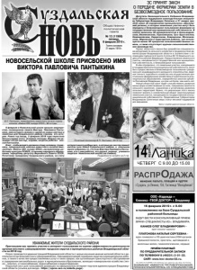 Газета основана 21 марта 1918 г. № 12 (11969) пятница, 8 февраля 2019 г. Общественно политическая газета ООО «Надежда+» Клиника «ТВОЙ ДОКТОР» г.Владимир 16 февраля 2019 г. с 9.00 в поликлинике на базе Суздальской районной больницы БУДУТ ВЕСТИ КОНСУЛЬТАТИВНЫЙ ПРИЕМ ВРАЧИ-СПЕЦИАЛИСТЫ ИЗ г. ВЛАДИМИРА: КАНАЕВ ОЛЕГ ВЛАДИМИРОВИЧ - врач-онколог-мамолог ПЛАТОНОВА НАТАЛЬЯ СЕРГЕЕВНА - врач-гинеколог и УЗ-диагностики (УЗИ органов брюшной полости, простаты, щитовидной и молочных желез, гинекологическое, сердца) ПРИЁМ ПЛАТНЫЙ ПО ПРЕДВАРИТЕЛЬНОЙ ЗАПИСИ ПО ТЕЛЕФОНУ 8 (49231) 2-01-22. САЙТ: www.tvoi-doctor33.ru. ВНИМАНИЕ! ИМЕЮТСЯ ПРОТИВОПОКАЗАНИЯ, ПРОКОНСУЛЬТИРУЙТЕСЬ СО СПЕЦИАЛИСТОМ. Лиц. №ЛО-33-01-002688 от 26.10.2018 выд. деп. здравоохр. адм. Влад. обл. Реклама ЗС ПРИНЯТ ЗАКОН О ПЕРЕДАЧЕ ФЕРМЕРАМ ЗЕМЛИ В БЕЗВОЗМЕЗДНОЕ ПОЛЬЗОВАНИЕ Депутаты Законодательного Собрания Владимирской области поддержали законодательную инициативу Губернатора Владимира Сипягина и 31 января приняли закон об определении муниципальных образований региона, в которых земельные участки могут быть переданы в безвозмездное пользование фермерам из государственной или муниципальной собственности. В список включены 50 муниципалитетов в Александровском, Вязниковском, Гороховецком, Гусь-Хрустальном, Камешковском, Киржачском, Ковровском, Меленковском, Муромском и Судогодском районах, где используется менее 50 процентов сельскохозяйственных земель, а также отсутствует крупное сельскохозяйственное производство. Проект областного закона был разработан специалистами департамента сельского хозяйства и продовольствия администрации Владимирской области в соответствии с положением подпункта 6 пункта 2 статьи 39.10 Земельного кодекса Российской Федерации «Предоставление земельного участка, находящегося в государственной или муниципальной собственности, в безвозмездное пользование». В нём определено, что земельные участки, находящиеся в государственной или муниципальной собственности, могут быть предоставлены в безвозмездное пользование гражданину для индивидуального жилищного строительства, ведения личного подсобного хозяйства или осуществления крестьянским (фермерским) хозяйством его деятельности в муниципальных образованиях, определённых законом субъекта Российской Федерации, на срок не более, чем шесть лет. Новый областной закон будет способствовать развитию малых форм хозяйствования на селе, повышению занятости сельского населения, сохранению и устойчивому развитию сельских территорий. Важно, что реализация этого закона позволит вовлечь в хозяйственный оборот неиспользуемые земельные участки, находящиеся в государственной или муниципальной собственности. Предложенные Губернатором Владимиром Сипягиным меры станут весомой поддержкой для фермеров. Пресс-служба администрации области. НОВОСЕЛЬСКОЙ ШКОЛЕ ПРИСВОЕНО ИМЯ ВИКТОРА ПАВЛОВИЧА ПАНТЫКИНА 6 февраля в Новосельской школе прошло мероприятие, посвященное памяти Виктора Павловича Пантыкина, имя которого связано с одной из самых светлых и памятных для Суздальского района страниц его истории. Ровно год назад, 2 февраля 2018 года перестало биться сердце этого человека-легенды. Именно так называют его до сих пор, а время, когда он работал - эпохой Пантыкина. И вот , чтобы воздать должное этому человеку-труженику, председателю некогда известного