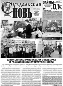 Газета основана 21 марта 1918 г. № 17 (11974) среда, 27 февраля 2019 г. Общественно политическая газета 19 февраля в Боголюбовской поселковой библиотеке состоялся конкурс «Выборы в Маленькой стране» - интерактивная программа для школьников». Он проводился среди учеников 6 «Б» класса Боголюбовской средней общеобразовательной школы имени чемпионки мира по шахматам Е.И. Быковой. В начале мероприятия школьники познакомились с основными понятиями избирательного права, посмотрели небольшую презентацию, подискутировали на тему «Что такое выборы и для чего они нужны?». Далее состоялись «выборы в Маленькой стране». Был организован импровизированный избирательный участок. Из состава ребят выбраны члены избирательной комиссии, представители средств массовой информации. Каждый избиратель-конкурсант получил свой паспорт, ознакомился с информацией о кандидатах, размещенной на информационном стенде, получил избирательный бюллетень. Избиратели осуществили свое активное избирательное право путем прямого и тайного волеизъявления. После подсчета голосов членами избирательной комиссии был подписан протокол об итогах голосования по «выборам Президента Маленькой страны». Представители средств массовой информации осветили ход голосования и результаты выборов. 20 февраля в Новосельской библиотеке состоялся брейнринг «Я – молодой избиратель!». Он проводился среди учеников 10-11 классов Новосельской средней общеобразовательной школы имени В.П.Пантыкина. В начале мероприятия старшеклассников поприветствовала председатель Территориальной избирательной комиссии Суздальского района Ирина Логинова. Она рассказала об избирательных кампаниях, которые будут проводиться на территории Суздальского района в 2019 году. Далее участники разделились на три команды и посмотрели небольшую презентацию, посвященную роли молодежи в выборах. Брейн-ринг состоял из четырех этапов. 1 этап «Найди общее» - командам нужно было определить, что общего на слайдах, представленных на экране. 2 этап «Формула всего» - команды должны были понять смысл сложения представленных им картинок. 3 этап «Штатный блиц» - участники команд на скорость отвечали на вопросы, посвященные избирательному праву. 4 этап «QWERTY» - участникам были розданы распечатки клавиатуры, по команде ведущего необходимо было «перевести» с английской раскладки слова, касающиеся избирательного процесса. 21 февраля в Новоалександровской основной общеобразовательной школе состоялся брейн-ринг «Интеллектуальная игра «Правовой калейдоскоп». Конкурс проводился среди учеников 7-9 классов. В начале мероприятия школьники познакомились с историей избирательного права, порядком формирования избирательных комиссий и порядком голосования. Брейн-ринг состоял из девяти раундов, в которых команды на скорость отвечали на вопросы по избирательному праву, рассматривали возможные ситуации на выборах и решали их, отгадывали зашифрованные слова, рисовали агитационные плакаты, соотносили отрывок из литературных произведений со статьями Конституции Российской Федерации. Все участники конкурсов показали не только отличные знания в области избирательного права, но и проявили смекалку, сплоченность, находчивость, сообразительность. По итогам конкурсов команды (участники), занявшие 1-3 места, были награждены Почетными г