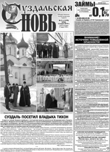 Газета основана 21 марта 1918 г. № 21 (11978) среда, 13 марта 2019 г. Общественно политическая газета 9 марта в городе Суздале прибывал с пастырским визитом митрополит Владимирский и Суздальский Тихон. Владыка посетил Музей деревянного зодчества Владимиро-Суздальского государственного музея-заповедника, где вместе с генеральным директором музея-заповедника Светланой Евгеньевной Мельниковой осмотрел экспозиции и принял участие в официальном открытии народных гуляний, посвященных последним дням масленичной недели. "Мы с вами, дорогие гости, строим в настоящее время новую Россию, в которой возрождаются духовнонравственные ценности, - заявил архипастырь, - мы сегодня празднуем вместе, всем народом. И уже Церковь не отделена от общества, как несколько десятилетий тому назад. С народными традициями передается дух народа, уважение к своей истории. Молодежь учится у старшего поколения не только тому, как нужно молиться, но и тому, как проводить свой досуг, как радоваться жизни". Позднее в Арт-отеле "Николаевский Посад" Высокопреосвященнейший Тихон принял участие в открытии межрегионального командного турнира «Золотое кольцо России» по фехтованию на шпагах среди детей 10-14 лет, где напутствовал молодых людей такими словами: "У нас особая надежда на спортивную молодежь, потому как вы должны быть лидерами в своей среде, должны быть примером для своих сверстников, которые не могут определиться в жизни, сформировать свое мировоззрение, выбрать правильные цель и смысл жизни". Владыка Тихон посетил также Спасо-Евфимиев монастырь, где поклонился мощам преподобного Евфимия, осмотрел фрески Спасо-Преображенского собора, мавзолей Дмитрия Михайловича Пожарского. http://spaso-evfimiev.ru/ СУЗДАЛЬ ПОСЕТИЛ ВЛАДЫКА ТИХОН 11 марта начался Великий Пост, который будет длиться 40 дней. 28 апреля - Пасха Христова. По случаю начала Великого Поста к жителям Владимирской области обратился митрополит Владимирский и Суздальский Тихон (обращение его читайте на 2-й странице). *** Владыка Тихон на открытии турнира «Золотое кольцо России» по фехтованию в Арт-отеле «Николаевский Посад». У мощей преподобного Евфимия. Владыка Тихон в Спасо-Евфимиевом монастыре. На официальном открытии народных гуляний. К сведению руководителей промышленных предприятий, строительно-монтажных организаций, колхозов, совхозов, фермерских и арендных хозяйств, других землепользователей и частных лиц. Владимирское ЛПУМГ - филиал ООО "Газпром трансгаз Нижний Новгород" уведомляет: по землям Суздальского района Владимирской области проходят магистральные газопроводы и газопроводы-отводы высокого давления (от 55 до 75 атмосфер), обеспечивающие потребности промышленных предприятий и населения района в природном газе, являющиеся объектами повышенной опасности! Строительными нормами и правилами СНиП III-Д.10-62 (Актуализированный СНиП 2.05.06-85) установлены ЗОНЫ МИНИМАЛЬНЫХ РАССТОЯНИЙ от осей газопроводов и границ газораспределительных станций (далее - ГРС) до населенных пунктов, отдельных промышленных и сельскохозяйственных предприятий, зданий и сооружений, отдельно стоящих нежилых и подсобных строений, гаражей и открытых стоянок для автотранспорта, коллективных садов, автомобильных и железных дорог. Зоны минимальных расстояний составляют от 100 до 350 метров в зависимости от класса и диаметра газопроводов, 