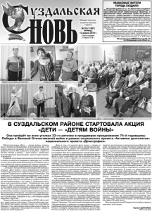 Газета основана 21 марта 1918 г. № 30 (11987) пятница, 12 апреля 2019 г. Общественно политическая газета УВАЖАЕМЫЕ ЖИТЕЛИ ГОРОДА СУЗДАЛЯ! В соответствии со ст. 21 Налогового кодекса Российской Федерации льгота по имущественным налогам носит заявительный характер, и физические лица, имеющие право на налоговые льготы, представляют в налоговый орган заявление о предоставлении налоговой льготы. Просим женщин 1963 года рождения и мужчин 1958 года рождения подать заявление в налоговый орган для предоставления льготы по имущественным налогам. При себе иметь паспорт, ИНН и документы, подтверждающие право собственности на имущество. Заявление необходимо подать в территориально обособленное рабочее место Межрайонной инспекции Федеральной налоговой службы России № 10 по Владимирской области в городе Суздаль по адресу: г. Суздаль, Красная площадь, д.1, 3-й этаж. Межрайонная ИФНС России № 10 по Владимирской области. Областная акция «Дети — «детям войны» стартовала 3 апреля во Владимире, в молодежном ДК, а 10 апреля достигла Суздаля. В актовом зале городской средней школы №2 собрались учащиеся, педагоги, жители города и района - «дети войны», представители ветеранских организаций, просто люди пожилого возраста. В рамках этой акции школьники и волонтеры будут готовить концерты и раздавать сувениры, вот почему в числе организаторов мероприятия в Суздале значились районный отдел социальной защиты населения, а также управление образования и отдел культуры. ...Отыграл гимн региональной общественной организации «Дети войны», всех собравшихся поприветствовала руководитель отдела социальной защиты населения Суздальского района Ирина Степанова. Она сообщила, что акция призвана поддержать тех, кто перенес тяготы военных лет в детстве, что нашим ветеранам предоставится возможность поделиться своими воспоминаниями о тех годах. К сожалению, ветераны-участники войны уходят... Тружеников тыла тоже немного. Вот и получается, что «дети войны» теперь стали самой многочисленной социальной категорией. В ходе концерта прозвучали песни и стихи, подготовленные силами учащихся двух суздальских школ. Выступающие напомнили, что довелось пережить детям в оккупации, в концлагерях и в условиях блокадного Ленинграда. Говорили о тех, у кого война украла здоровье и детство... Людмила Бундина, председатель ВРОО «Дети войны», представила свой проект «Письмо в бессмертие». Эта областная акция, которая только что стартовала, обещает стать массовой в масштабах всей страны по аналогии с маршами «Бессмертного полка», уверена Людмила Александровна. - Дело в том, что многие дети, внуки, а теперь и правнуки не могут посетить места захоронений своих погибших отцов, дедов или прадедов, или в силу географической удаленности, или из-за дороговизны поездки. Вот мы и предложили: пускай дети и внуки напишут письма своим родным, не вернувшимся с фронта. Пусть расскажут им, как сложилась их жизнь после войны. А мы отправим эти письма в места, где солдаты похоронены. В России эти письма прочитают у мест захоронений местные школьники, а может, волонтеры, которые потом спрячут письма в специальную капсулу и захоронят рядом. За границей письма родственников могли бы читать сотрудники посольств или добровольцы, знающие русский язык. Так мы сможем не только почтить память павших, но и собрать большой 