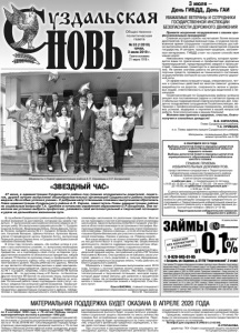 Газета основана 21 марта 1918 г. № 53 (12010) среда, 3 июля 2019 г. Общественно политическая газета В год юбилея Суздальского района необходимо обратить особое внимание на достижения, которыми мы можем гордиться. 11 выпускников школ района получили медали за отличную учебу. Это выпускники средней школы № 1 г. Суздаля: Соколов Алексей, Жидоморова Алёна, Ляпин Данила, Каткова Полина; средней школы № 2 г. Суздаля: Егорова Анастасия, Качалова Валерия, Щёкина Наталья, Куликова Ирина; ученик Стародворской школы Новиков Антон, выпускница Порецкой школы Серова Анна и Суздальской Православной гимназии Хализова Анна. В этом году получить медаль «За особые успехи в учении» стало значительно сложнее, т.к. выпускнику необходимо было не только иметь оценки «отлично» в аттестате по всем предметам, но и подтвердить свой статус на Едином государственном экзамене по обязательным предметам, набрав не менее 70 баллов по русскому языку и профильной математике, или получить оценку «пять» на экзамене по математике базового уровня. Нашим ребятам это удалось. Многие из них являются обладателями высоких и даже максимальных баллов по ряду предметов. Одна из учениц средней школы № 1 г.Суздаля, например, стала обладателем 98 баллов по химии, 96 – по русскому языку и 91 балла - по биологии. Другая получила 98 баллов по русскому языку, выпускница Суздальской Православной гимназии – 96 баллов по истории. Остальные ребята также подтвердили свой статус «золотых» медалистов успешной сдачей экзаменов. Такими результатами можно гордиться! Все медалисты являются стипендиатами администрации Суздальского района, победителями и призерами муниципального этапа Всероссийской олимпиады школьников по различным предметам. Многие из них принимали участие в региональном этапе олимпиады школьников. Одна из выпускниц СОШ № 2 г.Суздаля участвовала в областной олимпиаде по астрономии и географии. Выпускница первой школы – в региональном этапе телевизионной олимпиады «Умники и умницы», и по ее итогам была приглашена Юрием Вяземским для участия в съемках телевизионной олимпиады «Умники и умницы» на «Первом канале». Все наши медалисты не только отличники учебы. Многие из них достигли высот в спорте, творчестве, общественной деятельности, являются лидерами школьных детских объединений, председателями Совета старшеклассников. К выпускникам-медалистам обратилась директор Стародворской средней школы, заслуженный учитель РФ Татьяна Николаевна Жилина. Она призвала их не забывать своих учителей, уважать и чтить родителей и, получив образование, обязательно вернуться на родную землю, чтобы работать на благо Суздальского района. Обращаясь к самым успешным выпускникам школ 2019 года, которых с полным правом можно назвать гордостью Суздальского района, можно сказать: «Мы верим в ваш интеллектуальный и творческий потенциал, молодой задор, которые дадут новый импульс для развития и процветания нашей страны. Не останавливайтесь на достигнутом, стремитесь к новым горизонтам знаний и творчества. Счастливого пути!» Ольга ВАСИНА, главный специалист управления образования администрации района. Фото М. Пахомовой. «ЗВЕЗДНЫЙ ЧАС» МАТЕРИАЛЬНАЯ ПОДДЕРЖКА БУДЕТ ОКАЗАНА В АПРЕЛЕ 2020 ГОДА 27 июня, в администрации Суздальского района под громкие аплодисменты родителей, педагогов, друзей лучшие выпускни