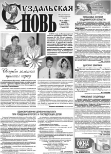 Газета основана 21 марта 1918 г. № 54 (12011) пятница, 5 июля 2019 г. Общественно политическая газета ЖАЛЮЗИ ПЛАСТИКОВЫЕ ОКНА Тел. 8 909 273 91 93 Найдете дешевле - сделаем скидку! ОГРНИП 318332800027483 от 04.05.2018 г. выдано МИФНС №1 по Влад. обл. Реклама РЕМОНТ, ЗАМЕНА, УСТАНОВКА Адрес: г.Суздаль ул.Ленина д.92 (быв. парикхмахерская). От всей души поздравляю вас с Днём семьи, любви и верности – всероссийским праздником, зародившимся на Владимирской земле! В его основу лёг день памяти святых благоверных князей Петра и Февронии Муромских, который все православные ежегодно отмечают 8 июля. Преданность этих святых друг другу стала легендой. Их любовь и верность, благочестие, милосердие и попечение о нуждах сограждан признаны всеми конфессиями России как идеал супружества. Семья – это основа человеческого мира. Семейные традиции и устои лежат в основе здорового общества и сильного государства. Семья – это самый главный для каждого человека оплот счастья и поддержки. Чем больше счастливых семей, тем счастливее и крепче наша страна! Сегодня семья находится в центре внимания государства. Задача демографического развития страны, пропаганда семейных ценностей как духовной основы нашего общества – один из важнейших государственных приоритетов. Именно на это нацелен национальный проект «Демография», в рамках которого во Владимирской области реализуются масштабные программы, направленные на всестороннюю поддержку семей, материнства и детства. Выражаю искреннюю признательность и желаю счастья родителям, достойно воспитывающим детей, супружеским парам с многолетним стажем семейной жизни, молодожёнам, а также тем, кто ещё только собирается создать новую ячейку общества. Пусть в вашем семейном очаге всегда горит неугасаемый огонь счастья, в семьях царит верность и преданность друг другу, пусть в каждом сердце всегда живет любовь! Мира и лада вашим семьям! В.В. СИПЯГИН, Губернатор области. УВАЖАЕМЫЕ ЖИТЕЛИ ВЛАДИМИРСКОЙ ОБЛАСТИ! ДОРОГИЕ ЗЕМЛЯКИ! УВАЖАЕМЫЕ СУЗДАЛЬЦЫ! Поздравляю вас с Днем семьи, любви и верности. Думаю, для вас, как и для меня, семья – это главное в жизни. С особой гордостью хочется отметить, что традиция праздновать День наших святых земляков, Петра и Февронии Муромских, стала общероссийской и получила признание зарубежом. Более 10 лет мы отмечаем День семьи, любви и верности. А вместе с нами его празднуют в Болгарии, Белоруссии, Азербайджане, Украине, Германии, Великобритании и Франции. Это доказывает: семейные ценности попрежнему важны для современного общества. Именно в семье человек черпает силы, чтобы жить. Отдельное поздравление для тех, кто именно сегодня решил создать свою семью, скрепить отношения священными узами брака. Дорогие молодожены, пусть ваши отношения строятся на любви и взаимном уважении. Пронесите эти чувства через всю жизнь. Берите пример с тех супружеских пар, которые счастливо прожили много лет вместе. Пусть семья, любовь и верность будут у каждого из нас! С праздником! В.Н.КИСЕЛЁВ, председатель Законодательного Собрания. Примите самые тёплые и сердечные поздравления со светлым праздником — Днём семьи, любви и верности! Этот день, отмечаемый 8 июля, имеет глубокую и духовно богатую историю, связанную с почитанием памяти святых Петра и Февронии, чей брак является образцом супружества, любви и верности. Семья, любовь, верность, з