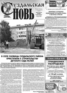 Газета основана 21 марта 1918 г. № 56 (12013) пятница, 12 июля 2019 г. Общественно политическая газета БОЛЬШОЙ АССОРТИМЕНТ, ШИРОКАЯ ЦВЕТОВАЯ ГАММА Тюль, органза, вуаль, турецкая сетка, портьерная ткань. ГРАНДИОЗНАЯ РАСПРОДАЖА! ЦКД г. Суздаля (Красная площадь, дом 5) Готовые изделия для кухни, постельное белье, настольная клеёнка. 15 июля с 9.00 до 18.00 Реклама от 100 руб. за метр. ЖАЛЮЗИ ПЛАСТИКОВЫЕ ОКНА Тел. 8 909 273 91 93 Найдете дешевле - сделаем скидку! ОГРНИП 318332800027483 от 04.05.2018 г. выдано МИФНС №1 по Влад. обл. Реклама РЕМОНТ, ЗАМЕНА, УСТАНОВКА Адрес: г.Суздаль ул.Ленина д.92 (быв. парикмахерская). В СЕЛЕ СНОВИЦЫ СУЗДАЛЬСКОГО РАЙОНА ПРИСТУПИЛИ К СТРОИТЕЛЬСТВУ ДЕТСКОГО САДА-ЯСЛЕЙ В конце мая текущего года был заключен муниципальный контракт на строительство детского сада-яслей в с. Сновицы на 108 мест. Это уже второй такой объект в районе, который строится благодаря участию Владимирской области в национальном проекте "Демография". Первый строится в пос. Боголюбово. И, если в пос. Боголюбово подрядчики приступили к выполнению работ практически после заключения муниципального контракта, то в с. Сновицы возникли проблемы. Поздравляю вас с профессиональным праздником! День российской почты был учреждён Указом Президента РФ. В этом году его отмечают 14 июля (во второе воскресенье июля) в 25-й раз. Изначально главной миссией почтальонов было помогать людям поддерживать связь, общаться и обмениваться информацией. В современном мире развития интернет-коммуникаций роль почтовых отделений поменялась, но не стала меньше. Сейчас через отделения связи проходит огромное количество товаров, которые люди заказывают через интернет. А в сельской местности сотрудникам почты приходится быть и социальными работниками - доставлять пенсии, привозить продукты и лекарства, рассказывать людям о новостях и помогать советом. Примите слова искренней признательности за вашу многогранную, нужную работу. Желаю вам успехов, крепкого здоровья и только хороших новостей. В.Н.КИСЕЛЁВ, председатель Законодательного Собрания Владимирской области. УВАЖАЕМЫЕ СОТРУДНИКИ ФЕДЕРАЛЬНОЙ ПОЧТОВОЙ СЛУЖБЫ И ВЕТЕРАНЫ ОТРАСЛИ! С начала июня на выбранном для строительства в с. Сновицы земельном участке проходили подготовительные работы. Были перенесены коммуникации и решался вопрос о демонтаже незаконно установленных жителями металлических гаражей. На данный момент площадка полностью подготовлена, вырыт котлован и начался монтаж фундаментов. По завершению общестроительных работ будет благоустроена близлежащая территория с асфальтированием подъездных дорог и проведено устройство парковочных мест. В настоящее время рассматривается вопрос переноса оставшихся коммуникаций в подземное исполнение. В целом комплекс мероприятий по строительству детсада в соответствии с контрактом планируется завершить до конца текущего года, а открытие объекта и прием малышей состоится в 1 квартале 2020 года. - Проблемных вопросов при строительстве возникает много, но мы провели серьезную работу по конкурсному отбору генерального подрядчика строительства, который имеет материальные и финансовые ресурсы, а также большой опыт по строительству социальных объектов. В настоящее время строительные работы по Сновицкому детскому саду ведутся с небольшим отставанием от графика ввиду сложности производства работ в ст