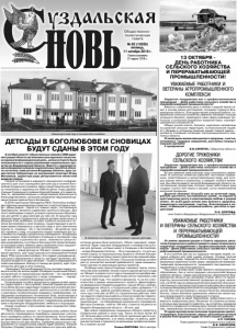 Газета основана 21 марта 1918 г. № 82 (12039) пятница, 11 октября 2019 г. Общественно политическая газета Сердечно поздравляю вас с профессиональным праздником – Днём работника сельского хозяйства и перерабатывающей промышленности! Верность избранному делу и любовь к родной земле лежат в основе ваших достижений, которыми гордится Владимирская область. Благодаря вашей усердной работе, современное сельское хозяйство уверенно занимает позиции успешного бизнеса, привлекая в свою сферу новейшие технологии и успешные разработки аграрной науки, квалифицированных специалистов. Общие усилия власти, бизнеса, населения направлены на развитие сельских территорий, на благополучие людей. И я убеждён в успешном решении нашей главной задачи – раскрыть огромный потенциал агропромышленного комплекса области. От всей души желаю вам крепкого здоровья, счастья, оптимизма, трудовых свершений, достойных наград и хороших урожаев! С праздником! В.В.СИПЯГИН, Губернатор области. УВАЖАЕМЫЕ РАБОТНИКИ И ВЕТЕРАНЫ АГРОПРОМЫШЛЕННОГО КОМПЛЕКСА! 13 ОКТЯБРЯ - ДЕНЬ РАБОТНИКА СЕЛЬСКОГО ХОЗЯЙСТВА И ПЕРЕРАБАТЫВАЮЩЕЙ ПРОМЫШЛЕННОСТИ! ДОРОГИЕ ТРУЖЕНИКИ СЕЛЬСКОГО ХОЗЯЙСТВА! Сердечно поздравляю вас с профессиональным праздником – Днем работника сельского хозяйства и перерабатывающей промышленности! Во все времена крестьянский труд пользовался уважением. В сельском хозяйстве работают настоящие подвижники, ответственные и целеустремленные люди, для которых родная земля и кормилица, и предмет особого внимания. Вы обеспечиваете жителей Владимирской области качественными продуктами питания, ваши заботливые руки создают тысячи тонн зерна и овощей, сотни наименований молочной продукции. Дорогие земляки! Спасибо вам за нелегкий труд, умение достигать поставленных целей, за верность крестьянскому долгу и неиссякаемую любовь к родной земле. От всей души желаю вам крепкого здоровья, прекрасного настроения, счастья, благополучия в семьях, стабильной и успешной работы, достатка и процветания! О.Н. ХОХЛОВА, член Совета Федерации Федерального Собрания РФ. 8 октября комитет общественных связей и СМИ администрации области организовал для журналистов региона единый информационный день, целью которого было познакомиться с ходом реализации национальных проектов во Владимирской области. Вместе с журналистами возводимые в рамках национальных проектов объекты посетили глава региона Владимир Сипягин, врио заместителя Губернатора по внутренней политике Игорь Моховиков, директора ряда департаментов областной администрации. Первой остановкой в маршруте насыщенного информационного дня стал строящийся детский сад в поселке Боголюбово Суздальского района. Здесь представительную группу чиновников и журналистов СМИ встречал Глава администрации Суздальского района Алексей Сараев, его заместитель по жизнеобеспечению и общественной безопасности Александр Авсеенок, начальник управления образования администрации района Ольга Богданова. В 2018 году Указом Президента РФ В. Путина был утвержден перечень национальных проектов, в числе которых и проект «Демография». Одной из главных задач, поставленных Президентом, является содействие занятости женщин. Для этого необходимо создать условия в дошкольном образовании для детей от двух месяцев до трех лет. В прошлом году админис
