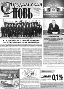 Газета основана 21 марта 1918 г. № 90 (12047) пятница, 8 ноября 2019 г. Общественно политическая газета Особое значение в своей работе полицейские придают борьбе с наркопреступностью, кражам из жилищ граждан, преступлениям экономической направленности (в том числе коррупции), борьбе с современными видами мошенничества (дистанционными и через сеть Интернет). Местные жители сами дают положительную оценку работе местных стражей порядка, называя район спокойным и весьма безопасным в криминальном плане. К таким же выводам, можно сказать, пришли и члены комиссии из аппарата УМВД России по Владимирской области, которые в августе этого года в течение 10 дней (!) проводили инспекторскую проверку ОМВД. Она касалась всех направлений деятельности отдела и была весьма профессиональной и скрупулёзной. Серьёзных нарушений в работе суздальских полицейских, нарушений законодательства РФ и прав граждан, а также нарушений дисциплины сотрудниками ОМВД выявлено не было. Деятельность нашего отдела МВД получила оценку удовлетворительно (из оценочных категорий удовлетворительно и не удовлетворительно). Начальнику ОМВД подполковнику полиции Дмитрию Александровичу Ильину и руководителям подразделений удалось сформировать сплочённый, профессиональный, высокоработоспособный коллектив, которому по плечу большие и серьёзные задачи. Конечно же, тон в работе задают опытные и умелые сотрудники, которые служат примером для подражания всему личному составу. Таким, например, является заместитель начальника полиции ОМВД подполковник полиции Алексей Владимирович Тонкачеев, курирующий деятельность сотрудников уголовного розыска и подразделения по борьбе с экономическими преступлениями. Его подчинённые, смело можно сказать – элита отдела, постоянно добиваются высоких показателей в работе, предпочитая, кстати, всегда находиться в тени. Высокой преданностью делу и огромной работоспособностью обладает помощник начальника ОМВД России по Суздальскому району – начальник отделения по работе с личным составом (ОРЛС) подполковник внутренней службы Павел Геннадьевич Королев. Он занимается формированием штата ОМВД, профессиональной подготовкой сотрудников, организаций многочисленных спортивных состязаний. На счету П.Г. Королева 134 поощрения, с десяток министерских почётных грамот, самая новая из которых была им получена «За активное участие в организации и проведении спортивных мероприятий МВД России, успешное выступление в составе спортивных сборных команд Министерства во всероссийских и международных соревнованиях в 2018 году» совсем недавно. Уверенно к числу лучших сотрудников можно отнести оперативного дежурного дежурной части майора полиции Евгения Анатольевича Продиуса, старшего оперуполномоченного ОУР майора полиции Сергея Витальевича Бобунова, старшего участкового уполномоченного полиции майора полиции Дмитрия Анатольевича Резниченко, командира 2-го отделения отдельного взвода ППС прапорщика полиции Николая Геннадьевича Гусева, водителя дежурной части прапорщика полиции Евгения Александровича Дуба. Весьма достойных сотрудников в ОМВД немало, в том числе и среди вольнонаёмного состава. У СУЗДАЛЬСКИХ СТРАЖЕЙ ПОРЯДКА ЗАСЛУЖЕННО ВЫСОКАЯ РЕПУТАЦИЯ К своему профессиональному празднику - Дню сотрудника органов внутренних дел суздальски