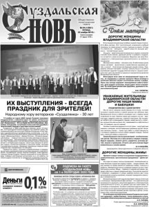 Газета основана 21 марта 1918 г. № 94 (12051) пятница, 22 ноября 2019 г. Общественно политическая газета УВАЖАЕМЫЕ ЖИТЕЛИ ГОРОДА СУЗДАЛЯ, НАПОМИНАЕМ ВАМ! Вы можете подписаться в редакции по адресу: г. Суздаль, Красная площадь, д. 1, каб. 12,18. Стоимость подписки с доставкой газеты на дом в г. Суздале на 6 месяцев – 330 рублей (не менее 5 экземпляров с доставкой по одному адресу), с получением газеты в редакции – 300 рублей. УВАЖАЕМЫЕ ЖИТЕЛИ СЕЛ ПАВЛОВСКОЕ, ТОРЧИНО, ПОРЕЦКОЕ, ОМУТСКОЕ, ПОСЕЛОК КРАСНОГВАРДЕЙСКИЙ! Сообщаем вам, что у редакции есть возможность доставлять вам газету «Суздальская новь». Подписаться на газету можно в Красногвардейской сельской библиотеке у библиотекаря Культяевой Валентины Ивановны, в Торчинской библиотеке у Назаровой Антонины Вячеславовны, в Павловской библиотеке у библиотекаря Надежды Дмитриевны Петрушиной, в с. Порецкое у Галины Александровны Молчановой в магазине, в с. Омутское в библиотеке у библиотекаря Надежды Николаевны Марининой. Стоимость подписки на 6 месяцев – 350 рублей. ПОДПИСКА НА ГАЗЕТУ «СУЗДАЛЬСКАЯ НОВЬ» НА 1-е ПОЛУГОДИЕ 2020 ГОДА В последнее воскресенье ноября в нашей стране отмечается День матери. Этот трогательный, искренний и добрый праздник по праву можно считать главным на земле, потому что именно вы – женщины – дарите миру его высшую ценность – человеческую жизнь! Эта дата – замечательная возможность сказать огромное спасибо всем мамам, дарящим детям то доброе и мудрое, что остаётся с ними на все времена. Выразить им свою благодарность и безграничную признательность за любовь и понимание. Материнская любовь – великая сила. В заботливых руках наших матерей – физическое и нравственное здоровье детей, а значит – благополучное будущее нашей страны. Поддержка женщин-матерей, помощь семьям была и остаётся важнейшей задачей государственной власти. Защита материнства и детства является одним из приоритетов развития Владимирской области. Благодарю всех мам за каждодневный труд и ласку, за поддержку и умение прощать! Ваша великая и почётная миссия служит источником жизни и добра. Пусть вас всегда окружает повседневная забота близких, дети радуют успехами, внуки дарят тепло и внимание. От всей души желаю вам здоровья, душевного покоя и благополучия! В.В. СИПЯГИН, Губернатор области. Примите самые теплые и искренние поздравления с замечательным, трогательным праздником – Днем матери! Это один из самых теплых праздников, посвящённый самым близким и дорогим сердцу людям – нашим мамам. Образ матери по праву является символом любви, чуткости и доброты. Материнское тепло согревает каждого из нас с первой минуты жизни. Мама – первый и главный наставник, мудрый советчик и самый преданный друг. Она всегда защитит и убережет, поддержит в самую трудную минуту, даст силы для решения сложных проблем, поможет преодолеть невзгоды и неприятности. Великий материнский труд всегда будет самым почетным и значимым. Празднование Дня матери – это замечательная возможность выразить свою благодарность и безграничную признательность за все, что делают для нас наши мамы, за их любовь и понимание. Особые слова благодарности хочется сказать в этот день многодетным мамам, женщинам, которые стали вторыми мамами детям-сиротам и детям, оставшимся без попечения родителей. От всей души желаем всем мамам Суздальского района здо