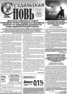 Газета основана 21 марта 1918 г. № 96 (12053) пятница, 29 ноября 2019 г. Общественно политическая газета Реклама На заседании депутаты приняли проект решения о бюджете района на 2020 год и на плановый период 2021 и 2022 годы в первом чтении, назначили публичные слушания по проекту решения Совета народных депутатов о бюджете района, внесли изменения в бюджет Суздальского района на 2019 год, плановый период 2020 и 2021 годов, принятый еще в конце прошлого года. О бюджете Суздальского района на 2020 год и плановый период 2021-2022 годов доложил депутатам Сергей Белов, заместитель Главы администрации района, начальник управления по экономике и финансам администрации района. Основные характеристики бюджета муниципального образования Суздальский район на 2020 год: прогнозируемый общий объем доходов районного бюджета - 1020319,2 тыс. рублей; общий объем расходов районного бюджета – 1021722,6 тыс. рублей; дефицит районного бюджета – 1403,4 тыс. рублей. Основные характеристики бюджета муниципального образования Суздальский район на 2021 год: прогнозируемый общий объем доходов районного бюджета – 1023868,6 тыс. рублей; общий объем расходов районного бюджета – 1023373,8 тыс. рублей, в том числе условно утвержденные расходы – 11683,4 тыс. рублей; профицит районного бюджета – 494,8 тыс. рублей. Основные характеристики бюджета муниципального образования Суздальский район на 2022 год: прогнозируемый общий объем доходов районного бюджета -1133748,6 тыс. рублей, общий объем расходов районного бюджета – 1127954,6 тыс. рублей, в том числе условно утвержденные расходы в сумме 23207,1 тыс. рублей; профицит районного бюджета – 5794 тыс. рублей. О внесенных дополнениях и изменениях в бюджет на 2019 год, 2020-2021 годы рассказала депутатам Людмила Борзова, начальник бюджетного отдела управления по экономике и финансам администрации района. По проекту решения Совета народных депутатов Суздальского района «О бюджете Суздальского района на 2020 год и на плановый период 2021 и 2022 годов» депутаты назначили публичные слушания, которые решено провести 25 декабря в 9 часов утра в администрации района. Проводятся слушания по инициативе Совета народных депутатов, их ведущим определен Владимир Кириллов. На этом заседании Совета депутаты заслушали Татьяну Срибную по вопросу объявления конкурса на замещение должности Главы администрации Суздальского района и об утверждении проекта контракта. Руководствуясь законодательством, Уставом Суздальского района, Совет народных депутатов принял решение: объявить конкурс на замещение должности Главы администрации района, назначив его на 23 декабря 2019 года в 10.00 в администрации района. Время приема документов, подаваемых в конкурсную комиссию для участия в конкурсе : с 5 декабря по 16 декабря 2019 года с 9.00 до 16.00 в рабочие дни. Депутаты назначили членов конкурсной комиссии по проведению конкурса на замещение должности Главы администрации Суздальского района, назначив в нее Владимира Кириллова, Главу Суздальского района, председателя Совета, Татьяну Срибную, заместителя Главы администрации Суздальского района по социальным вопросам и Галину Черникову, начальника управления организационной работы, муниципальной службы и работы с населением администрации района. Право назначения членов комиссии имеет и Губернатор области, которого известят о конкурсе соответствующим письмом. Ирина БЕЛАН. 