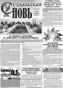 Газета основана 21 марта 1918 г. № 97 (12054) среда, 4 декабря 2019 г. Общественно политическая газета Реклама УВАЖАЕМЫЕ ЖИТЕЛИ ГОРОДА СУЗДАЛЯ, НАПОМИНАЕМ ВАМ! Вы можете подписаться в редакции по адресу: г. Суздаль, Красная площадь, д. 1, каб. 12,18. Стоимость подписки с доставкой газеты на дом в г. Суздале на 6 месяцев – 330 рублей (не менее 5 экземпляров с доставкой по одному адресу), с получением газеты в редакции – 300 рублей. УВАЖАЕМЫЕ ЖИТЕЛИ СЕЛ ПАВЛОВСКОЕ, ТОРЧИНО, ПОРЕЦКОЕ, ОМУТСКОЕ, ПОСЕЛКА КРАСНОГВАРДЕЙСКИЙ! Сообщаем вам, что у редакции есть возможность доставлять вам газету «Суздальская новь». Подписаться на газету можно в Красногвардейской сельской библиотеке у библиотекаря Культяевой Валентины Ивановны, в Торчинской библиотеке у Назаровой Антонины Вячеславовны, в Павловской библиотеке у библиотекаря Надежды Дмитриевны Петрушиной, в с. Порецкое у Галины Александровны Молчановой в магазине, в с. Омутское в библиотеке у библиотекаря Надежды Николаевны Марининой. Стоимость подписки на 6 месяцев – 350 рублей. Справки по телефону 8 (49231) 2-08-95 ПОДПИСКА НА ГАЗЕТУ «СУЗДАЛЬСКАЯ НОВЬ» НА 1-е ПОЛУГОДИЕ 2020 ГОДА Реклама КТО НЕ ОПЛАТИЛ НАЛОГИ, ПРОСИМ СРОЧНО ОПЛАТИТЬ! УВАЖАЕМЫЕ ЖИТЕЛИ ГОРОДА СУЗДАЛЯ! 2 декабря 2019 года истек срок уплаты имущественных налогов (земельного, транспортного и налога на имущество физических лиц), начисленных за 2018 год. Всех, кто не оплатил налоги, просим срочно оплатить! По всем вопросам необходимо обратиться в территориально обособленное рабочее место Межрайонной инспекции Федеральной налоговой службы России № 10 по Владимирской области в городе Суздаль по адресу: г. Суздаль, Красная площадь, д.1, 3-й этаж, контактный телефон 2-12-61. Администрация города Суздаля. В работе «круглого стола» принимали участие представители департамента образования администрации Владимирской области, глава администрации г.Суздаля, руководители и работники кадровых служб предприятий ресторанного и гостиничного сервиса, сотрудники и студенты колледжа. На встрече были вручены благодарственные письма департамента образования за помощь в организации практической подготовки следующим предприятиям г.Суздаля: ИП Ландышева Л.Н., ООО «Турцентр», ООО «Золотой ручей», ООО «Велий Отель Суздаль». С актуальными вопросами сотрудничества образовательных учреждений и работодателей выступали Болтунова С.А., заместитель директора департамента образования, Таран Е.В., начальник отдела профессионального образования департамента, Скрябина О.С., руководитель областного центра профессиональной ориентации молодежи, Сахаров С.В., глава администрации города Суздаля, Малашкин В.В., директор колледжа, Кузина В.Ф., заведующая отделением по специальности «Гостиничный сервис» колледжа, Солдатова Т.И., мастер производственного обучения колледжа, Березина Е.А., менеджер по персоналу ООО «Велий Отель Суздаль», Ландышева Л.Н., индивидуальный предприниматель, Говердовский А.А., специалист по кадрам ООО «Турцентр», Фролов А.В., генеральный директор ООО «ДЫМОВ КЭПИТАЛ». За «круглым столом» шла речь о возможностях сетевого взаимодействия колледжа с работодателями региона, обсуждались актуальные проблемы и приоритетные направления сотрудничества. Колледжем был представлен свой опыт взаимодействия с работодателями на примере специальности «Гостиничный сервис» и професси