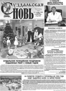 Газета основана 21 марта 1918 г. № 1-2 (12062-12063) пятница, 10 января 2020 г. Общественно политическая газета 30 декабря 2019 года в рамках благотворительной акции «Полицейский Дед Мороз» местные стражи порядка - специалист по воспитательной работе отделения по работе с личным составом капитан внутренней службы А.В. Голева (Снегурочка), начальник отделения по делам несовершеннолетних майор полиции С.С. Кудряшова, участковый уполномоченный полиции лейтенант полиции А.П. Грознов и в недавнем прошлом один из старейших сотрудников отдела, а с недавних пор ветеран МВД В.В. Тихонов (Дед Мороз), посетили воспитанников Суздальского специального (коррекционного) детского дома, над которым ОМВД шефствует уже немало лет, и устроили ребятам праздник. Радость от которого, кстати, была обоюдной. Гости совместными усилиями с детьми зажгли ёлку, водили хороводы, слушали как воспитанники читают стихи, поют песни… Приехали полицейские не с пустыми руками, а с гостинцами, приобретёнными на добровольные взносы сотрудников ОМВД. Каждому ребёнку был вручён новогодний подарок. Немало сладостей и фруктов было оставлено ребятам впрок. Конечно же, шефы пожелали воспитанникам всего наилучшего в новом, 2020 году. ОМВД России по Суздальскому району. Фото В. Сухова. СУЗДАЛЬСКИЕ ПОЛИЦЕЙСКИЕ ПОЗДРАВИЛИ ПОДШЕФНЫХ РЕБЯТ С НОВЫМ ГОДОМ НА РАЗВИТИЕ СУЗДАЛЯ И ГОРОХОВЦА ДО 2024 ГОДА БУДЕТ ВЫДЕЛЕНО БОЛЕЕ 3,5 МЛРД РУБЛЕЙ Между администрацией Владимирской области и Министерством культуры Российской Федерации подписаны договоры (соглашения) о реализации подпроектов региона, направленных на проведение реставрационных работ в рамках проекта «Комплексное развитие территорий и инфраструктуры малых исторических поселений». Он осуществляется Минфином России и Минкультуры России совместно с Новым банком развития (НБР). Предварительно общий объём финансовых средств на реализацию подпроектов в срок до 2024 года превысит 3,5 млрд рублей. Предваряющая подписание договоров работа велась областной администрацией с 2018 года при активном участии глав администраций Гороховецкого района Дмитрия Наумова и города Суздаля Сергея Сахарова, а также председателя правления Ассоциации развития исторических поселений «Русская провинция» Сергея Рыбакова. Осуществление проекта «Комплексное развитие территории и инфраструктуры малых исторических поселений» придаст импульс развитию их обеспечивающей инфраструктуры, реставрации памятников культурного наследия, строительству новых объектов туристического показа, поможет благоустроить уже имеющиеся и построить новые рекреационные зоны, что значительно повлияет на увеличение туристического потока не только в муниципальные образования, но и в регион в целом. Пресс-служба администрации области. Сердечно поздравляю вас с профессиональным праздником - 298-ой годовщиной создания органов прокуратуры Российской Федерации и 75-летием прокуратуры Владимирской области! Охранять законность и правопорядок - одна из наиболее почетных и ответственных задач, стоящих перед нашим ведомством. Компетентность, глубокая порядочность, верность долгу - вот те качества, которые присущи сотрудникам прокуратуры. Вам приходится принимать совсем нелегкие решения, преодолевать трудности, которыми изобилует наша работа. Но я точно знаю, что весь наш коллектив способе