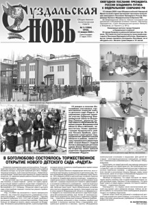 Газета основана 21 марта 1918 г. № 3 (12064) среда, 15 января 2020 г. Общественно политическая газета 10 января в поселке Боголюбово состоялось торжественное открытие нового детского сада «Радуга». В церемонии открытия приняли участие Губернатор Владимирской области Владимир Сипягин, директор департамента образования администрации Владимирской области Ольга Беляева, заместитель Главы администрации Суздальского района Татьяна Срибная, руководители структурных подразделений администраций области и района, заместитель генерального директора ООО «Строй-Инвест» Андрей Котов и заведующая детским садом Елена Филимонцева. На открытие также пришли родители с будущими воспитанниками «Радуги». В БОГОЛЮБОВО СОСТОЯЛОСЬ ТОРЖЕСТВЕННОЕ ОТКРЫТИЕ НОВОГО ДЕТСКОГО САДА «РАДУГА» Название учреждению дали жители района. Пока детский сад строился, администрация Суздальского района объявила конкурс на лучшее название для него. Победительница конкурса, а ей стала жительница с. Новое Оксана Королькова также была приглашена на торжественное открытие. От администрации района Оксане был вручен памятный подарок. А сам детский сад стал прекрасным подарком жителям посёлка, а самое главное – детям. Его здесь ждали. В настоящее время в районе существует очередность в детские сады в двух крупных населенных пунктах — в пос. Боголюбово и в с. Сновицы. Открытие нового детского сада в Боголюбове поможет полностью решить проблему очерёдности. - Рад, что 2020 год начинается с такого прекрасного события, как открытие дошкольного учреждения в Суздальском районе, - сказал Владимир Сипягин. – Наконец мы вместе добились того, что у нас не будет проблем с ясельными группами в поселке Боголюбово. Родителям больше не придется возить своих малышей во Владимир. Это важно и для развития детей, и для их родителей, которые смогут посвятить освободившееся время семье и трудоустройству. После торжественного перерезания ленточки, все гости были приглашены на экскурсию по детскому саду. Новое учреждение оборудовано по последнему слову техники. «Это первый в области детский сад, который строился по проекту «Содействие занятости женщин - создание условий дошкольного образования для детей в возрасте до трёх лет», в рамках национального проекта «Демография» и основная особенность учреждения - наличие ясельных групп, где готовы принимать малышей, начиная с 2 месяцев. Наличие таких групп было обязательным условием для участия в федеральном проекте. Благодаря участию в этом проекте Владимирской области из федерального бюджета на строительство детского сада было выделено 59 миллионов рублей, еще более 21 миллиона рублей было выделено из областного и районного бюджетов», - отметила в своем выступлении Татьяна Срибная. Для приема малышей в саду созданы комфортные условия: в ясельных группах полы с подогревом, специальные кроватки и манежи, группы оборудованы пеленальными столиками и игрушками. Для детей постарше - многофункциональные помещения, оснащенные современным развивающим и обучающим оборудованием. Посмотреть на новый детский сад пришли малыши и из действующего на территории пос. Боголюбово детского сада № 2, для гостей мероприятия они подготовили несколько творческих номеров, а завершилось мероприятие песней в исполнении Оксаны Иващук, мамы троих мальчишек, двое из к
