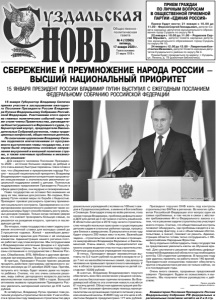 общественно политическая газета УЗДАЛЬСКАЯ 2 № 4 (12065) пятница, 17 января 2020 г. ТОЧКА ЗРЕНИЯ СОЦИАЛЬНАЯ ПОДДЕРЖКА Владимир Владимирович Путин значительную часть своего выступления посвятил мерам по укреплению благосостояния россиян. Запланировано расширение и увеличение размера социальной поддержки малообеспеченных граждан, семей с детьми. Эти деньги будут вкладываться людьми в приобретение товаров, жилья. В итоге это будет способствовать росту экономики, мы получим мультипликативный эффект, что, безусловно, хорошо. ДЕМОГРАФИЯ Владимир Путин уделил большое внимание вопросу рождаемости. Президент предлагает значительно увеличить маткапитал – до 616 617 рублей при рождении двоих детей. Но получить большую часть денег можно будет уже при рождении первого ребенка, а остаток на второго. Для нашего региона вопрос рождаемости стоит очень остро. На 1 января 2019 года во Владимирской области проживало 1 млн 365,4 тыс., что на 12,9 тыс меньше, чем годом ранее (1 млн 378,3 тыс. человек). Это сокращение стало максимальным в течение последних лет. На протяжении 28 лет численность населения региона в среднем сокращалась на 10 тысяч человек в год. Мы работаем над этим вопросом. Например, в нашем регионе есть такая мера поддержки, как материнский капитал при рождении или усыновлении третьего или последующих детей. Сейчас он составляет более 60 тысяч рублей. Но в свете Послания Президента, может быть, нам стоит подумать над увеличением этой суммы. Возможно, до 100 тысяч рублей или даже больше. Кроме этого, в нашем регионе многодетные семьи имеют право еще на ряд выплат и мер поддержки, в том числе, мы выделяем им земельные участки, помогаем строить дома, отправляем детишек бесплатно отдыхать в лагеря и не только. Думаю, нам стоит еще подумать в этом направлении, поскольку вопрос действительно серьезный. Мы можем предложить увеличить льготы по налогам для многодетных, это первое, что пришло в голову. Но нужно, повторюсь, подумать. ЭКОЛОГИЯ Президент говорил и о важности защиты экологии нашей планеты в целом. В том числе, Владимир Владимирович сделал упор на теме раздельного сбора мусора. Сейчас это больной вопрос для нашего региона. После старта мусорной реформы во Владимире убрали все контейнеры для сортировки отходов, разрушили существующую систему раздельного сбора мусора. Я обязательно с губернатором на эту тему переговорю. И обязательно в кратчайшее время нужно систему раздельного сбора мусора восстановить. Важно, чтобы реформы не ухудшали, а улучшали ситуации. И хорошо работающую систему разрушать недопустимо. НАЗНАЧЕНИЕ ВЫСШИХ ДОЛЖНОСТНЫХ ЛИЦ Президент предложил предоставить право ГД РФ утверждать кандидатуру премьер-министра, при этом Президент будет обязан назначить на должность кандидата, утвержденного ГД РФ. После этого премьер-министр будет представлять в ГД РФ кандидатуры для утверждения вице-премьеров и федеральных министров. Мы, соответственно, у себя должны идти по этому пути. Мы приняли решение о согласовании вице-губернаторов, но, я думаю, в перспективе можно подумать не только об утверждении заместителей губернатора, но и директоров профильных департаментов. ПОДГОТОВКА К ПРАЗДНОВАНИЮ ПОБЕДЫ Еще одной центральной темой президентского послания стали вопросы ПОСЛАНИЕ ПРЕЗИДЕНТА РОССИИ ФЕДЕРАЛЬНОМУ СОБРАНИЮ КОММЕНТИРУЮТ ФЕДЕРАЛЬНЫ