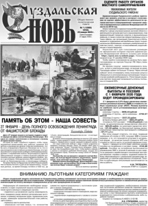 Газета основана 21 марта 1918 г. № 7 (12068) среда, 29 января 2020 г. Общественно политическая газета Администрация Суздальского района приглашает вас принять участие в интернет-голосовании по оценке эффективности деятельности органов местного самоуправления городских округов и муниципальных районов Владимирской области за 2019 год. Опрос проводится администрацией Владимирской области с целью изучения мнения жителей области о деятельности органов местного самоуправления, глав администраций городских округов и муниципальных районов, а также о качестве предоставляемых услуг в таких сферах, как организация транспортного обслуживания и содержание автомобильных дорог в муниципальном образовании, жилищно-коммунальное хозяйство (тепло-, электро- и газоснабжение, водоснабжение и водоотведение). Опросный лист для голосования размещен на официальном интернет-портале администрации Владимирской области (ссылка для входа - https://opros.avo.ru/ankets.page). Голосование продлится до 31 декабря 2020 года. Чтобы пройти голосование вы должны быть зарегистрированы на портале Госуслуг РФ https://www. gosuslugi.ru/. На портале госуслуг имеется возможность получить услуги в электронном виде, не выходя из дома. Процедура займет не больше 10 минут. Через личный кабинет легко отслеживать этапы получения услуги и обращаться в уполномоченные организации только в случаях крайней необходимости. Регистрация на данном портале также дает возможность оплаты госпошлин со скидкой 30%. УВАЖАЕМЫЕ ЖИТЕЛИ СУЗДАЛЬСКОГО РАЙОНА! ОЦЕНИТЕ РАБОТУ ОРГАНОВ МЕСТНОГО САМОУПРАВЛЕНИЯ ЕЖЕМЕСЯЧНЫЕ ДЕНЕЖНЫЕ ВЫПЛАТЫ И ПОСОБИЯ С 1 ФЕВРАЛЯ 2020 ГОДА БУДУТ ПРОИНДЕКСИРОВАНЫ С 1 февраля на 3,0% будут увеличены ежемесячные денежные выплаты (ЕДВ) и стоимость набора социальных услуг (НСУ). Размер выплаты по наиболее часто устанавливаемым категориям составит: инвалиды 1группы — 3896,43 рублей инвалиды 2 группы , дети-инвалиды - 2782,67 рублей инвалиды 3 группы — 2227,55 рубля ветераны боевых действий — 3062,00 рубля. Стоимость НСУ составит - 1155,06 рублей в том числе: на дополнительное лекарственное обеспечение - 889,66 рубля, на санаторно-курортное лечение -137,63 рубля, на бесплатный проезд железнодорожным транспортом пригородного сообщения -127,77 рубля. При этом следует отметить, что лица, подавшие заявление об отказе от НСУ, получают ЕДВ в полном размере, а те, кто пользуется услугами в натуральной форме , за вычетом полной стоимости НСУ или стоимости той его части, от которой оформлен отказ. Также с 1 февраля на 3,0% будет увеличен размер пособия на погребение и составит сумму - 6124,86 рублей. Пособие на погребение выплачивается управлением ПФР в течение 6 месяцев со дня смерти на умершего неработающего пенсионера при предоставлении: справки о смерти, трудовой книжки любому обратившемуся с указанными документами независимо от наличия родственных отношений. Пособие на работающих пенсионеров выплачивается по месту работы. Н.М. ТЯГЛЕЦОВА, начальник УПФР в г. Суздале. Дата 27 января вошла в историю подвига нашего народа как День снятия блокады Ленинграда. Это одна из самых трагических и печальных страниц истории нашей страны. История не знает подобного подвига, чтобы город, окруженный захватчиками, жил, работал, сражался. Его жители и руководство делали тогда все возможное, чтобы жить и продолжать бороться. Несмотря на то, что город находился 