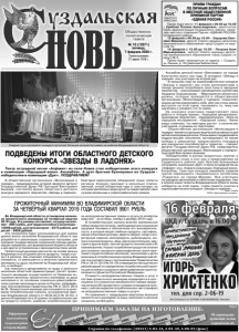 Газета основана 21 марта 1918 г. № 10 (12071) пятница, 7 февраля 2020 г. Общественно политическая газета В общественной организации «Милосердие и порядок», председателем которой является депутат Государственной Думы РФ Григорий Викторович Аникеев, состоялся финал областного детского конкурса народного творчества «Звезды в ладонях». Ежегодно мероприятие объединяет юные таланты региона. Конкурс проходит в несколько этапов: заочный, очный отборочные туры и гала-концерт, на котором зрителям и жюри артисты представляют свои лучшие вокальные и хореографические номера. Каждый год в оргкомитет конкурса поступает большое количество заявок из районов Владимирской области. ПОДВЕДЕНЫ ИТОГИ ОБЛАСТНОГО ДЕТСКОГО КОНКУРСА «ЗВЕЗДЫ В ЛАДОНЯХ» Театр эстрадной песни «Алфавит» из села Новое стал победителем этого конкурса в номинации «Народный вокал. Ансамбли». А дуэт братьев Кузнецовых из Суздаля - победителем в номинации «Дуэт». ПОЗДРАВЛЯЕМ! ИП Степанов С.А. ОГРНИП 31601800056022. Реклама Ансамблю детской песни «Фантазеры» из города Кольчугино всего три года. В конкурсе «Звезды в ладонях» они участвуют во второй раз. - В прошлом году на хореографическом конкурсе «Звезды в ладонях» мы стали дипломантами и теперь решили попробовать свои силы в народном творчестве, - рассказывает руководитель коллектива Людмила Скоромникова. – Мероприятия областного уровня, которые проводятся в общественной организации «Милосердие и порядок» позволяют нашим детям реализовать себя. Для них очень важно выступать на этой сцене, показывать то, чему они научились и узнавать что-то новое. На конкурсе участники представляют свои работы в четырех жанрах: «Народное декоративноприкладное творчество», «Народный вокал», «Игра на народном инструменте», «Народный танец». Члены жюри отмечают, что ежегодно растет и количество участников, и уровень их подготовки. - Общественная организация «Милосердие и порядок» является центром творческой активности для детей и молодежи региона. Очень важно поддерживать подрастающее поколение, мотивировать на новые победы и свершения, предоставлять площадку для раскрытия способностей и талантов, - говорит депутат Государственной Думы РФ, председатель общественной организации «Милосердие и порядок» Григорий Викторович Аникеев. Победителями в разных возрастных группах и номинациях стали в этот раз и представители из Суздальского района: дуэт братьев Кузнецовых из Суздаля, номинация «Дуэт» и театр эстрадной песни «Алфавит» из с. Новое в номинации «Народный вокал. Ансамбли». Гран-при конкурса завоевала средняя группа образцового танцевального коллектива «Родничок» из города Мурома. Все участники награждены дипломами и памятными подарками. Уже в апреле юные таланты Владимирской области вновь соберутся на этой сцене, чтобы принять участие в хореографическом конкурсе «Звезды в ладонях». Пресс-служба ВПОО «Милосердие и порядок». ПРИНИМАЕМ ЗАКАЗЫ НА ИЗГОТОВЛЕНИЕ: PR-сопровождение организаций, частных и юридических лиц Информационноиздательский центр Суздальского района «СУЗДАЛЬ-МЕДИА» - р а » сайтов флаеров листовок альбомов книг газет буклетов календарей Справки по телефонам: (49231) 2-03-34, 2-01-39, 2-08-95 (факс) Реклама ПРИЕМ ГРАЖДАН ПО ЛИЧНЫМ ВОПРОСАМ В МЕСТНОЙ ОБЩЕСТВЕННОЙ ПРИЕМНОЙ ПАРТИИ «ЕДИНАЯ РОССИЯ» Прием будут вести: 11 февраля с 09.00 до 10.00