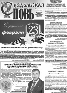 Газета основана 21 марта 1918 г. № 14 (12075) пятница, 21 февраля 2020 г. Общественно политическая газета Защита родной земли – благородная и почетная миссия. Неизменными символами российского воинства были и остаются мужество, стойкость, самоотверженность и патриотизм. Мы по праву гордимся подвигами наших дедов и прадедов, которые внесли значимый вклад в историю Отечества. Мы выражаем глубокую признательность ветеранам Великой Отечественной войны, труженикам тыла, участникам локальных боевых действий. Отдаем дань уважения тем, кто сегодня несет военную службу на благо Родины. Наша задача - сохранить многовековые ратные традиции России, воспитывать подрастающее поколение на примерах героических судеб наших соотечественников. В этот праздничный день примите искренние пожелания крепкого здоровья, семейного благополучия, счастья, мира и добра! С уважением, депутат Государственной Думы РФ, председатель общественной организации «Милосердие и порядок» Григорий Викторович Аникеев. р Гр ДОРОГИЕ ЗЕМЛЯКИ! ПРИМИТЕ ИСКРЕННИЕ ПОЗДРАВЛЕНИЯ С ДНЕМ ЗАЩИТНИКА ОТЕЧЕСТВА! УВАЖАЕМЫЕ ЖИТЕЛИ ВЛАДИМИРСКОЙ ОБЛАСТИ! Примите наши искренние поздравления с Днём защитника Отечества! Самое ценное, что есть в нашей жизни – это мир, спокойствие и стабильность, поэтому этот праздник всегда будет символом мужества, самоотверженности, достоинства и чести. История России неразрывно связана с борьбой за свободу и процветание родной земли. Мы должны помнить, как наши славные предки ценою собственной жизни спасали страну от вражеских вторжений, защищали её целостность и суверенитет, твёрдо отстаивали её интересы. Подвиги защитников Отечества – это та большая и великая правда, которую нельзя исказить и перечеркнуть. Всем, кто служил и служит в Российской армии и в силовых ведомствах, говорим спасибо за нелёгкий ратный труд. Низкий поклон ветеранам, чья жизнь стала примером для последующих поколений россиян. Дорогие земляки! Пусть и в дальнейшем готовность каждого из нас защищать свою страну гарантирует независимость и процветание любимой Родины! Желаем вам счастья, здоровья, мира и благополучия! В.В. СИПЯГИН, Губернатор Владимирской области. В.Н. КИСЕЛЁВ, председатель Законодательного Собрания Владимирской области. С.С. МАМЕЕВ, Главный федеральный инспектор по Владимирской области. ДОРОГИЕ ЗЕМЛЯКИ! День защитника Отечества – один из самых главных и всенародно любимых праздников в нашей стране. Каждый год 23 февраля мы начинаем праздничные торжества с поклона – в память о подвиге российских воинов, отдавших жизнь за великую Россию на фронтах войны и в «горячих точках» планеты. А нынешний год для нас особенный – Год памяти и славы. Сегодня защитником Отечества является каждый, кто считает своим долгом беречь родную землю, защищать её интересы, чья жизнь и работа подчинены единой цели – благополучию и процветанию нашей великой страны. От всей души желаю всем крепкого здоровья, счастья и мира! Пусть ваши добрые дела служат на благо России, содействуют ее стабильности и процветанию! О.Н. ХОХЛОВА, член Совета Федерации Федерального Собрания РФ. От имени администрации и Совета народных депутатов Суздальского района примите искренние поздравления с Днём защитника Отечества. День защитника Отечества имеет богатую и славную историю. Для всех поколений нашей стр