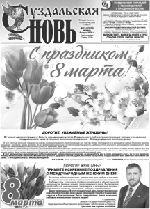Газета основана 21 марта 1918 г. № 18 (12079) пятница, 6 марта 2020 г. Общественно политическая газета Вы несете любовь и гармонию, делаете мир ярче, добрее и красивее. Вы дарите нам свою заботу и вдохновляете на достижение новых высот. Добиваетесь успехов в профессиональной и общественной деятельности, бережно храните тепло домашнего очага. Вы окружаете детей заботой и вниманием, развиваете у них важные духовнонравственные ценности: милосердие, доброту и справедливость. Дорогие женщины! В этот праздничный день примите искренние пожелания успехов во всех ваших начинаниях! Крепкого здоровья, счастья и благополучия! Пусть каждый день будет наполнен любовью и вниманием близких людей! С уважением, депутат Государственной Думы РФ, председатель общественной организации «Милосердие и порядок» Григорий Викторович АНИКЕЕВ. ДОРОГИЕ ЖЕНЩИНЫ! ПРИМИТЕ ИСКРЕННИЕ ПОЗДРАВЛЕНИЯ С МЕЖДУНАРОДНЫМ ЖЕНСКИМ ДНЕМ! 8 марта В этот светлый весенний праздник мы всегда стремимся выразить переполняющие нас чувства любви, благодарности и восхищения самым близким и дорогим женщинам — матерям, женам, дочерям. Во все времена женщина была и остается символом красоты и доброты, тепла и чуткости, милосердия и справедливости. Благодаря вам незыблемыми остаются такие ценности, как семья, дети, дом. Вы обладаете удивительной способностью совмещать домашние заботы с профессиональной деятельностью, достигаете высот в самых разных сферах деятельности, успешно занимаетесь бизнесом и политикой, активно участвуете в общественной жизни. Вы вдохновляете нас, мужчин, на мужественные поступки и плодотворную работу. Наши успехи невозможны без вашей поддержки, любви и терпения, огромной внутренней силы. В этот праздничный день позвольте поблагодарить вас за безграничное терпение, за вашу заботу, уют и тепло домашнего очага, за то, что наполняете нашу жизнь особым смыслом! Желаем вам крепкого здоровья, счастья, удачи, весеннего настроения, осуществления всех заветных мечтаний и желаний. С ПРАЗДНИКОМ ВАС, МИЛЫЕ ЖЕНЩИНЫ! А.П.САРАЕВ, Глава администрации Суздальского района. В.В. КИРИЛЛОВ, Глава Суздальского района. ДОРОГИЕ, УВАЖАЕМЫЕ ЖЕНЩИНЫ! От имени администрации и Совета народных депутатов Суздальского района примите самые теплые и искренние поздравления с замечательным весенним праздником – Международным женским днем! Справки по телефону 8 (49231) 2-08-95 Реклама НАПОМИНАЕМ, ЧТО НА НАШУ ГАЗЕТУ МОЖНО ПОДПИСАТЬСЯ С ЛЮБОГО МЕСЯЦА ДО 20 ЧИСЛА НА ПОЧТЕ, В РЕДАКЦИИ С ЛЮБОГО ЧИСЛА. Стоимость подписки в редакции на 1 месяц – 50 руб., с доставкой по г. Суздалю (не менее 5 экземпляров на один адрес) – 55 руб., по району – 60 руб. Оформить подписку можно по адресу: г. Суздаль, Красная пл., д. 1 (каб. 12,18). МЫ САМИ ПОЗАБОТИМСЯ О БЫСТРОЙ ДОСТАВКЕ ГАЗЕТЫ НА ВАШ АДРЕС! Также есть возможность выписать газету жителям с. Цибеево, Павловское, Порецкое, п. Красногвардейский. ВЫПИСАВ ГАЗЕТУ, ВЫ ВСЕГДА БУДЕТЕ В КУРСЕ СОБЫТИЙ ГОРОДА, РАЙОНА, ОБЛАСТИ! ПОЗДРАВЛЯЕМ ЧИТАТЕЛЕЙ И РЕКЛАМОДАТЕЛЕЙ С ПРАЗДНИКОМ ВЕСНЫ! !