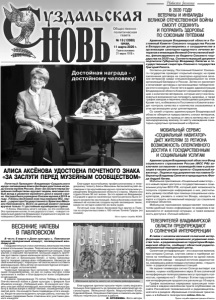 общественно политическая газета УЗДАЛЬСКАЯ 2 № 19 (12080) среда, 11 марта 2020 г. ДЕЛА. СОБЫТИЯ. ЛЮДИ 11 марта свой юбилей отмечает директор Суздальского филиала Владимиро-Суздальского музея-заповедника Алла Зайкова. Алла Савировна с 2014 года является директором Суздальского филиала Государственного Владимиро-Суздальского музея-заповедника, самого большого филиала. Возглавлять, обеспечивать жизнедеятельность, координировать работу многопрофильного комплекса такого уровня может только руководитель, обладающий высокими организационными характеристиками и ответственностью за порученное дело. Неоценим вклад юбиляра в разработку и организацию праздников на территории музея. Большое внимание Алла Зайкова уделяет воспитанию подрастающего поколения посетителей, научно-просветительской работе в филиале и в городе. Благодаря личному участию Зайковой А.С. в районной газете «Суздальская новь» издаётся приложение «Музейный ГРАД», на страницах которого постоянно публикуются материалы об истории и жизни города-музея. За большую краеведческую, исследовательскую и культурно-просветительскую деятельность Зайкова А.С. удостоена звания лауреата городской премии в области культуры, литературы и искусства имени А.Д. Варганова. Как истинный патриот Суздаля и неравнодушный гражданин, Зайкова А.С. уделяет огромное внимание сохранению его исторического и архитектурного облика. Она – активист Всероссийского Общества охраны памятников, начиная с 90-х годов, а с 2007 года, на общественных началах, избрана председателем президиума Суздальского отделения. А.С. Зайкова награждена медалью ордена «За заслуги перед Отечеством» второй степени. Коллектив музея-заповедника от всего сердца поздравляет Аллу Савировну с прекрасным юбилеем и желает долгих лет творческой жизни! СУЗДАЛЬ СТАЛ ДЛЯ НЕЕ СУДЬБОЙ Дорогая Алла Савировна, С ЮБИЛЕЕМ! Любим Вас, ценим, рады общению с Вами! щ С уважением, редакция газеты «Суздальская новь» и ее главный редактор Ирина Белан. Во Владимирской области с 11 по 16 марта пройдет Открытый российский фестиваль анимационного кино. Мероприятия его пройдут на площадках ряда городов и поселков области, однако главные события, открытие и закрытие главного анимационного форума страны состоятся по традиции в Суздале, соответственно 11 марта в 19 часов и 15 марта в 17 часов в ГТК. Еще одна из концертных программ состоится в ДК поселка Боголюбово 13 марта в 13 часов. Встречу проведет композитор и детский писатель Татьяна Залужная. Фестиваль анимации организует и проводит кинокомпания «Мастер-Фильм» при поддержке Министерства культуры РФ и администрации Владимирской области. Запланировано участие полутора тысяч профессионалов отрасли, проведение творческих и деловых встреч — ведь в Суздаль приедут «за русскими мультфильмами» представители международных фестивалей, отбирающих достойные ленты. Показы мультфильмов в этом году пройдут на 36 площадках области, что порадует и детей, и взрослых. В жюри будет немало известных «звезд», режиссеров-аниматоров и киноведов. К сожалению, не приедет главная «звезда»: 10 марта японский режиссер Кодзи Ямамура принял решение не приезжать в Суздаль в связи с эпидемией коронавируса. Мэтр приносит свои извинения российским коллегам и фестивальной публике. Вместо запланированного мастер-класса японског