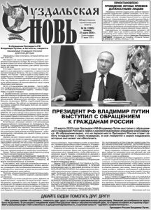 Газета основана 21 марта 1918 г. № 24 (12085) пятница, 27 марта 2020 г. Общественно политическая газета В обращении Президента РФ Владимира Путина, в частности, говорится. УВАЖАЕМЫЕ ГРАЖДАНЕ РОССИИ! ДОРОГИЕ ДРУЗЬЯ! Обращаюсь к вам по вопросу, который сейчас волнует всех нас. Мы видим, как остро развивается ситуация с эпидемией коронавируса в мире. Во многих странах продолжает нарастать число заболевших. Под ударом оказалась вся мировая экономика, уже сейчас прогнозируется её спад. Благодаря заранее принятым мерам нам в целом удаётся пока сдерживать и широкое, и стремительное распространение болезни. Но мы с вами должны понимать, что Россия – просто даже в силу своего географического положения – не может отгородиться от угрозы. Рядом с нашими границами находятся государства, уже серьёзно поражённые эпидемией, и полностью заблокировать её проникновение в нашу страну объективно невозможно. Но то, что мы можем и уже делаем, – так это работать профессионально, организованно и на опережение. И ГЛАВНЫЙ ПРИОРИТЕТ ЗДЕСЬ – ЖИЗНЬ И ЗДОРОВЬЕ НАШИХ ГРАЖДАН. К развёртыванию системы своевременной медицинской помощи и профилактики подключены все возможности и ресурсы. Хочу особо обратиться к врачам, фельдшерам, медицинским сёстрам, сотрудникам больниц, поликлиник, ФАПов, служб скорой помощи, к нашим учёным. Вы сейчас на переднем крае защиты страны. Сердечно благодарю всех вас за самоотверженный труд. ПРОШУ ГРАЖДАН С ПРЕДЕЛЬНЫМ ВНИМАНИЕМ ОТНЕСТИСЬ К РЕКОМЕНДАЦИЯМ ВРАЧЕЙ И ОРГАНОВ ВЛАСТИ. От этого сейчас очень многое зависит. Особенно это касается наиболее уязвимых групп населения: людей старшего поколения и тех, кто страдает хроническими заболеваниями. И для них, и для всех граждан сейчас стоит задача максимально снизить риски. Естественно, возникает вопрос и об организации общероссийского голосования по поправкам в Конституцию, с предварительно определённой датой – 22 апреля. Вы знаете, как серьёзно, насколько серьёзно я к этому отношусь. И, конечно, буду просить вас прийти и высказать своё мнение по этому вопросу – принципиальному, ключевому для нашей страны, для нашего общества. Однако, как уже говорил ранее, абсолютным приоритетом для нас является здоровье, жизнь и безопасность людей. Поэтому считаю, что ГОЛОСОВАНИЕ НЕОБХОДИМО ПЕРЕНЕСТИ НА БОЛЕЕ ПОЗДНЮЮ ДАТУ. Оценим, как будет развиваться ситуация и в регионах, и в целом по стране, и, только опираясь на профессиональное мнение, рекомендации врачей, специалистов, примем решение о новом дне голосования. Далее. Сейчас крайне важно предотвратить угрозу быстрого распространения болезни. Поэтому ОБЪЯВЛЯЮ СЛЕДУЮЩУЮ НЕДЕЛЮ НЕРАБОЧЕЙ, С СОХРАНЕНИЕМ ЗАРАБОТНОЙ ПЛАТЫ. То есть, ВЫХОДНЫЕ ДНИ ПРОДЛЯТСЯ С СУББОТЫ, 28 МАРТА ПО ВОСКРЕСЕНЬЕ, 5 АПРЕЛЯ. Естественно, все структуры жизнеобеспечения, в том числе медицинские учреждения, аптеки, магазины, учреждения, обеспечивающие банковские, финансовые расчёты, транспорт, а также органы власти всех уровней продолжат свою работу. Повторю, длинные выходные предусмотрены именно для того, чтобы снизить скорость распространения болезни. Обращаюсь ко всем гражданам страны. Давайте не будем поступать, полагаясь на наше русское «авось». Не думайте, пожалуйста, как у нас бывает: «А, меня это не коснется!» Это может коснуться каждого. И тогда-то, что происходит сегодня во м