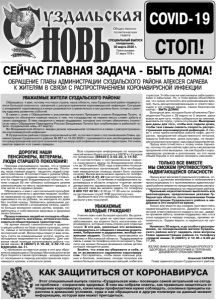 Газета основана 21 марта 1918 г. СПЕЦИАЛЬНЫЙ ВЫПУСК понедельник, 30 марта 2020 г. Общественно политическая газета СТОП! COVID-19 КАК ЗАЩИТИТЬСЯ ОТ КОРОНАВИРУСА СЕЙЧАС ГЛАВНАЯ ЗАДАЧА - БЫТЬ ДОМА! ОБРАЩЕНИЕ ГЛАВЫ АДМИНИСТРАЦИИ СУЗДАЛЬСКОГО РАЙОНА АЛЕКСЕЯ САРАЕВА К ЖИТЕЛЯМ В СВЯЗИ С РАСПРОСТРАНЕНИЕМ КОРОНАВИРУСНОЙ ИНФЕКЦИИ ДОРОГИЕ НАШИ ПЕНСИОНЕРЫ, ВЕТЕРАНЫ, ЛЮДИ СТАРШЕГО ПОКОЛЕНИЯ! Природа коронавируса такова, что в первую очередь он представляет угрозу для вас. Поэтому, наша главная задача - защитить людей старшего поколения. В соответствии с указом Губернатора области о режиме повышенной готовности на территории Владимирской области, жители старше 65 лет обязаны соблюдать режим самоизоляции по месту проживания граждан, в том числе и в садовых домах. Обращаюсь к вам с настоятельной просьбой: ограничьте контакты с другими людьми, особенно приезжими из других мест проживания, вернувшимися из-за рубежа, не выходите из дома без особой нужды. Займитесь домашними делами, подготовкой к огородному сезону, уделите больше внимания своим детям, внукам, позаботьтесь о собственном здоровье и здоровье своих близких. Прошу пожилых людей не посещать общественные места, магазины, аптеки и не пользоваться общественным транспортом. На время вашей самоизоляции в администрации района на базе отдела культуры, спорта, семьи и молодежной политики создан волонтерский штаб. Волонтеры помогут вам оплатить счета за коммунальные услуги, купить необходимые медикаменты и продукты. Для оказания такой помощи организована работа «горячей линии» 8 (49231) 2-18-42, 2-52-12 или 8(800)200-34-11. С призывом оставаться дома в эти дни обратился к верующим и Патриарх Московский и всея Руси Кирилл в своей проповеди - воздержаться от посещения в период распространения коронавируса храмов, а молиться дома. Всю справочную информацию по вопросам пенсий можно будет получить в УФПР в г.Суздале по телефонам: (849231) 2-02-23, 2-14-62. В соответствии с постановлением главного санитарного врача по Владимирской области до 30 апреля 2020 года ограничено посещение медицинских организаций. Вся необходимая медицинская помощь может быть оказана на дому. Вызов врача можно сделать по телефону 8 (49231) 2-01-22 (регистратура поликлиники в г. Суздале). По лечению и профилактике коронавируса в области открыта «горячая линия» департамента здравоохранения. Свои вопросы по данной теме вы можете задать по телефону 8 800 707 42 52 с 8.30 до 17.30 или по телефону экстренных служб 112 (круглосуточно). Выпишите все эти телефоны, чтобы они всегда были у вас под рукой. УВАЖАЕМЫЕ МОЛОДЫЕ ГРАЖДАНЕ! У меня к вам тоже большая просьба. Вы должны понимать, что даже не чувствуя симптомов заболевания, вы можете быть носителями коронавируса, который очень опасен для пожилых людей. В эти дни, насколько это возможно, воздержитесь от общения с вашими родителями, бабушками и дедушками, вообще пожилыми людьми. Особенно, приехавшими из Москвы и Московской области. Поддерживайте связь с ними по телефону или по интернету. Уделите как можно больше внимания своим детям, которые находятся дома. Знайте, что этим вы убережете и себя, и их от возможности заражения коронавирусом. Постарайтесь, чтобы ваши пожилые родные и близкие, знакомые, соседи получали как можно больше положительных эмоций, избегали стрессов. Чтобы они не чувствовали себя одинокими и забытыми. Но, в тоже 