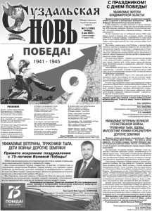 Газета основана 21 марта 1918 г. № 31 (12092) пятница, 8 мая 2020 г. Общественно политическая газета Примите самые искренние поздравления с Днем Великой Победы! День Победы – это боль и слезы радости, это память сердца, которую бережно хранит каждая российская семья. Это то, что объединяет нас и делает непобедимыми перед лицом любых испытаний. За коротким, но емким словом «Победа» стоит мужество и героизм советских солдат, напряженный и тяжелый труд в тылу. 1418 дней и ночей длилась Великая Отечественная война. Безмерно высокой ценой досталась нам Великая Победа. Миллионы погибших и пропавших без вести, миллионы искалеченных людских судеб. Свой вклад в Великую Победу внесли и жители Суздальского района. За годы войны из г. Суздаля и района было призвано более 13000 человек, с полей сражений не вернулись более 7 тысяч человек. Многие наши земляки отличились в боях за свободу и независимость нашей Родины. Четырнадцать из них стали Героями Советского Союза, четверо полными кавалерами Ордена Славы. Наравне с ратным незабываем и трудовой подвиг суздальцев. Трудящиеся района принимали активное участие во всенародном движении помощи фронту, жили и работали под лозунгом «Все для фронта! Все для Победы!». Низкий поклон вам, наши дорогие ветераны, защитники Отечества, всем кто приближал Победу на фронтах и в тылу, и светлая память защитникам нашей Родины, положившим свои жизни на алтарь Великой Победы! Спасибо вам за мирное небо над головой! За то, что вы ценой огромных усилий выстояли и победили в той страшной войне, за то, что сумели восстановить страну из руин. Желаем вам в этот праздничный день долгих лет жизни, крепкого здоровья, счастья! Мира, добра и благополучия вам, вашим родным и близким! С праздником, с Днём Великой Победы! А.П.САРАЕВ, Глава администрации Суздальского района. В.В. КИРИЛЛОВ, Глава Суздальского района. Примите самые искренние и сердечные поздравления с дорогим и волнующим праздником – Днём Победы в Великой Отечественной войне! В нём гордость и скорбь смешаны в наших сердцах. Нет другого такого дня, когда мы так отчётливо осознаем себя единым народом. Великая Отечественная война – это наша общая боль, а Великая Победа – наша общая радость. 75 лет отделяет нас от победной весны 1945 года. Война вошла в каждый дом, в каждую семью, оставив отпечаток в каждом сердце. Поднимались в атаку наши деды и отцы, ковали Победу в тылу женщины и дети. И сегодня, спустя десятилетия, мы чтим личный подвиг каждого из них. Мы знаем, какова цена этой Победы, и всегда будем помнить о ратных и трудовых подвигах тех, кто выстоял в героической борьбе за свободу и независимость Родины. Они сделали всё, чтобы подарить нам счастье жить в сильной, свободной и независимой стране, возможность учиться, мирно трудиться, растить детей и самим распоряжаться своей судьбой. Сегодня наша задача – сберечь историческую правду о той страшной войне, сохранить память о живых и павших героях, сделать всё, чтобы жизнь наших ветеранов была наполнена уютом и комфортом, заботой и теплом родных сердец. УВАЖАЕМЫЕ ВЕТЕРАНЫ И ТРУЖЕНИКИ ТЫЛА! Мы говорим вам – спасибо. Спасибо за радость весны 1945 года, за восстановленные города и сёла, за мирную жизнь послевоенных поколений. ДОРОГИЕ ЗЕМЛЯКИ! Пусть этот светлый майский праздник служит для каждого из нас источником гордости, наполняет сердца 