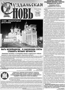 Газета основана 21 марта 1918 г. № 33 (12094) пятница, 15 мая 2020 г. Общественно политическая газета Поздравляем вас с профессиональным праздником – Международным днем музеев! Музеи являются носителями и хранителями материальной истории, культуры, характера и духа народа. Это особенный мир со своей особой миссией по созданию и сохранению историко-культурной среды. Бесценные сокровища, накопленные не одним поколением музейных работников, дают возможность больше узнать об истории и культуре нашей земли. Любой, даже самый маленький музей – настоящая машина времени, позволяющая напрямую соприкоснуться с прошлым, почувствовать движение истории. В этот день особые слова звучат в адрес сотрудников музеев — хранителей истории, увлечённых людей, создающих неповторимую атмосферу эпох — от древности до наших дней. На музейных работников возложена высокая и благородная миссия – сохранять историческое и культурное наследие нашего района, богатые многовековые традиции и достижения современности. Благодаря вам не прерывается связь времён, преемственность поколений, воспитывается бережное и уважительное отношение к истории, бесценным реликвиям прошлого, культуре и искусству. Именно от вас во многом зависит полнота и глубина исторического образа нашего района. Это большая честь и вместе с тем большая ответственность не только перед современниками, но и перед потомками. Владимиро-Суздальский музей-заповедник выполняет очень важную функцию по сохранению историко-культурного наследия нашего края. Благодаря неустанному, кропотливому труду сотрудников Суздальского филиала Владимиро-Суздальского музея-заповедника, которые отличаются профессионализмом, глубокими знаниями исторических и культурных традиций нашего народа экспозиции филиала Владимиро-Суздальского музея заповедника стали визитной карточкой Владимирского края. Мы гордимся своей историей, уважаем и чтим людей, которые ежедневным трудом создают новые ее страницы. Желаем вам творческой энергии, новых увлекательных открытий, благодарных посетителей, здоровья, счастья и благополучия! В.В. КИРИЛЛОВ, Глава Суздальского района. УВАЖАЕМЫЕ ВЕТЕРАНЫ И СОТРУДНИКИ МУЗЕЕВ СУЗДАЛЬСКОГО РАЙОНА! СУЗДАЛЬСКОЕ ОТДЕЛЕНИЕ ВСЕРОССИЙСКОГО ОБЩЕСТВА ОХРАНЫ ПАМЯТНИКОВ ИСТОРИИ И КУЛЬТУРЫ ПОЗДРАВЛЯЕТ С МЕЖДУНАРОДНЫМ ДНЁМ МУЗЕЕВ КОЛЛЕКТИВ ГОСУДАРСТВЕННОГО ВЛАДИМИРО-СУЗДАЛЬСКОГО МУЗЕЯ-ЗАПОВЕДНИКА! БЫТЬ МУЗЕЙЩИКОМ - В КАКОФОНИИ СУЕТЫ СЛЫШАТЬ МУЗЫКУ ВЕЧНОСТИ А.П. САРАЕВ, Глава администрации Суздальского района. С самого основания Общества, более полувека, самыми активными и последовательными защитниками и пропагандистами культурного наследия являются музейщики. И не случайно на учредительном съезде Общества в качестве делегата присутствовала генеральный директор музея-заповедника А.И. Аксёнова. А с самого начала деятельности Суздальского отделения музей-заповедник сотрудничает с отделением по вопросам культурного наследия Суздальской земли. Все эти десятилетия музей-заповедник является коллективным членом Общества, в настоящее время - единственным во Владимирской области. В оперативном управлении музея находятся самые ценные памятники нашего региона, а всего более 60 объектов, которые в целом содержатся достойно, несмотря на трудности с финансированием и законодательными сложно