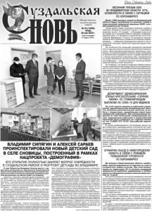 Газета основана 21 марта 1918 г. № 34 (12095) среда, 20 мая 2020 г. Общественно политическая газета 15 мая Губернатор Владимир Сипягин вместе с директором департамента образования Владимирской области Ольгой Беляевой и Главой администрации Суздальского района Алексеем Сараевым проверили качество выполненных на объекте работ (на снимках). «Заказчик, строители, администрация учреждения – все молодцы, с душой подошли к делу. Мы получили тот результат, на который нас ориентирует Президент России Владимир Путин, – высокое качество жизни людей. И особенно радует, что это высокое качество маленькие жители Новоалександровского сельского поселения будут ощущать с первых лет жизни», – отметил губернатор. Дошкольное образовательное учреждение на 108 мест построено в рамках реализации регионального проекта «Содействие занятости женщин – создание условий дошкольного образования для детей в возрасте до трёх лет» нацпроекта «Демография». На возведение этого социально важного объекта из областного бюджета было направлено почти 80,5 млн рублей. Софинансирование местного бюджета составило 4,2 млн рублей. В новом детском саду – 5 групп, 3 из которых – ясельные, для малышей от 2 месяцев до 3 лет. В помещениях созданы комфортные, современные условия для образовательной деятельности в соответствии со всеми санитарно-гигиеническими нормами. Заложена крепкая материально-техническая база: приобретено развивающее оборудование, интерактивные средства для обучения и творчества, красивая и безопасная мебель, игрушки. Территория вокруг учреждения также радует глаз. В детском садике будут трудиться 10 человек. Учреждение сможет принять первых воспитанников на третьем этапе снятия ограничений, введённых в период пандемии коронавируса по санитарно-эпидемиологическим соображениям. Что особенно важно, с открытием нового детсада полностью решается вопрос очерёдности в ДОУ в Суздальском районе с учётом детей, которые живут на территории Новоалександровского сельского поселения, но вынуждены посещать детские сады во Владимире. Кроме того, во всех территориях области, кроме Владимира, теперь полностью ликвидирован дефицит мест в ясельных группах. «Сейчас мы можем сосредоточить свои усилия на областном центре, где особенно нужны группы для самых маленьких. Четверо яслей по 50 мест построены во Владимире в прошлом году. В этом году начато возведение трёх объектов. В садике на 115 мест в новом микрорайоне Сновицы-Веризино уже заложен фундамент. Подрядчики также приступили к строительству двух яслей по 50 мест: одни – в том же активно растущем микрорайоне Сновицы-Веризино, вторые – на улице Тихонравова. Планируется завершить работы до конца этого года», – сообщил Владимир Сипягин. Пресс-служба администрации области. ВЛАДИМИР СИПЯГИН И АЛЕКСЕЙ САРАЕВ ПРОИНСПЕКТИРОВАЛИ НОВЫЙ ДЕТСКИЙ САД В СЕЛЕ СНОВИЦЫ, ПОСТРОЕННЫЙ В РАМКАХ НАЦПРОЕКТА «ДЕМОГРАФИЯ» ЕГО ОТКРЫТИЕ ПОЛНОСТЬЮ ЗАКРОЕТ ВОПРОС ОЧЕРЁДНОСТИ В СУЗДАЛЬСКОМ РАЙОНЕ И РАЗГРУЗИТ ДЕТСАДЫ ВО ВЛАДИМИРЕ ВЕСЕННИЙ ПРИЗЫВ-2020 ВО ВЛАДИМИРСКОЙ ОБЛАСТИ: ЕСТЬ ОСОБЕННОСТИ В СВЯЗИ С СИТУАЦИЕЙ ПО КОРОНАВИРУСУ Более 1400 молодых людей из Владимирской области будут направлены на военную службу в ходе весенней призывной кампании-2020, которая продлится до 15 июля. «Наши ребята будут проходить военную службу в границах Западного
