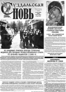 Газета основана 21 марта 1918 г. № 38 (12099) среда, 3 июня 2020 г. Общественно политическая газета 30 мая по инициативе Президента России Владимира Путина во Владимирскую область, как и в ряд других регионов страны, из Москвы приехала группа медицинских специалистов. В составе бригады 6 специалистов – врач-инфекционист, пульмонолог, анестезиолог-реаниматолог, рентгенолог, хирург и помощник анестезиолога-реаниматолога. В течение двух недель они будут передавать владимирским коллегам профессиональный опыт по борьбе с новой коронавирусной инфекцией. ВО ВЛАДИМИР ПРИЕХАЛА БРИГАДА СТОЛИЧНЫХ МЕДИКОВ ДЛЯ ПЕРЕДАЧИ ПРОФЕССИОНАЛЬНОГО ОПЫТА ПО ЛЕЧЕНИЮ ПАЦИЕНТОВ С COVID-19 ГУБЕРНАТОР ВЛАДИМИР СИПЯГИН УСТАНОВИЛ СТИМУЛИРУЮЩИЕ ВЫПЛАТЫ РАБОТНИКАМ ИНФЕКЦИОННЫХ ГОСПИТАЛЕЙ ИЗ ЧИСЛА ПРОЧЕГО ПЕРСОНАЛА На территории Областной клинической больницы, где разместился один из инфекционных госпиталей региона, междисциплинарную бригаду специалистов встречали первый заместитель Губернатора Владимирской области Сергей Шевченко, и.о. директора Департамента здравоохранения Владимирской области Юлия Арсенина, и.о. главного врача ОКБ Ольга Архипова, главные внештатные специалисты Департамента здравоохранения и другие представители медицинского сообщества. Коллеги из Москвы готовы поделиться не только профессиональным опытом, они привезли с собой гуманитарный груз – лекарственные препараты, средства индивидуальной защиты, экспресс-тесты для диагностики и медицинское оборудование. Сергей Шевченко поблагодарил за поддержку Президента России Владимира Путина, мэра Москвы Сергея Собянина, систему здравоохранения столицы. – Помощь здравоохранению Владимирской области со стороны столичного региона неслучайна, поскольку Москва, Московская область, а также западные районы Владимирской области являются частью общей столичной агломерации, которая в большей степени подвержена инфицированию Covid-19. Обмен мнениями и опытом будет очень полезен. Мы намерены выработать совместный план действий по борьбе с Covid-19 в нашем регионе, – отметил Сергей Шевченко. По словам заместителя Губернатора, в последнее время во Владимирской области отмечается стабилизация эпидемиологической обстановки, и число госпитализируемых в инфекционные подразделения уменьшается. В регионе достаточно свободного коечного фонда для госпитализации пациентов, которые нуждаются в реанимационных мероприятиях. Кроме того, регион-33 перевыполнил нормативы Минздрава РФ по диагностике Covid-19. – У нас показатель тестирования на 100 тысяч населения составляет около 100, а необходимо 70, – подчеркнул Сергей Шевченко. Опыт московских коллег поможет инфекционным службам Владимирской области усовершенствовать медпомощь тяжелобольным пациентам, освоить передовые методики спасения жизней пациентов и снижения уровня заболеваемости. Бригада московских специалистов уже приступила к работе на базе инфекционного госпиталя Областной клинической больницы. При этом без её внимания не остались и другие инфекционные госпитали региона. Консультативная помощь коллегам на местах будет оказываться с помощью телемедицинских технологий. По состоянию на 11:00 2 июня во Владимирской области лабораторно подтверждено 62 новых случая заболевания Covid-19. Из них 12 – в Александрове, 11 – в Гусь-Хрустальном, 10 – в Муроме