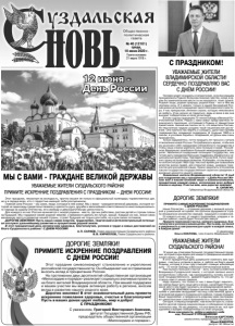 Газета основана 21 марта 1918 г. № 40 (12101) среда, 10 июня 2020 г. Общественно политическая газета Человек может не думать о патриотизме, но всем сердцем принадлежать Родине. Всем нам знакомо чувство, когда, в каком бы замечательном месте ты ни находился, тянет домой. Родные люди, родная природа, родной язык – вот в чём мы черпаем силы. И я уверен: только в нашей бескрайней России можно испытать ощущение такого безграничного простора. У нас прекрасная, великая страна, которую невозможно не любить. И ею нельзя не гордиться, ведь из века в век она выходит победителем из всех испытаний. В этом году мы празднуем 75-летие Победы в Великой Отечественной войне. Рядом с нами живут представители героического поколения, отстоявшего Родину от фашистских захватчиков. Низкий им поклон за то, что защитили Россию. Их неустанным трудом создано наше национальное достояние. Они научили нас беречь и созидать, дали нам пример товарищества, взаимной поддержки. В трудные 1990-е и сейчас, в условиях борьбы с эпидемией, их уроки нам очень пригодились. Только задумайтесь: почти тридцать лет прошло с начала становления новой России. Потребовалось время, чтобы все мы осознали себя гражданами обновлённого государства и чтобы наша страна укрепила свои позиции в мире. Российская Федерация приобрела большой международный авторитет. Увеличился социальный потенциал государства, оно готово дать гражданам бОльшую поддержку. Изменились национальные ориентиры: Президент России В.В. Путин нацелил страну на прорывное развитие. Я убеждён, что мы выросли из Конституции 1993 года. Настало время для повышения качества жизни людей, для открытия новых, широких горизонтов для российской нации. Нужно закрепить в Основном законе государства государственные гарантии гражданам и духовные ценности нашего народа. Уважаемые жители Владимирской области! Я ещё раз поздравляю вас с праздником – с Днём России! Желаю вам и вашим близким мира и взаимопонимания, процветания каждой семье, исполнения всех добрых планов и надежд. Счастья вам, мои дорогие земляки! В. СИПЯГИН, Губернатор Владимирской области. ПРИМИТЕ САМЫЕ ИСКРЕННИЕ ПОЗДРАВЛЕНИЯ С ДНЕМ РОССИИ! Наше Отечество — огромная держава с великой культурой и уникальной историей. На прочном фундаменте страна объединила множество народов, традиций и конфессий. От каждого из нас, от нашего трудолюбия, усердия и талантов зависит, какой будет Россия уже завтра. Примите пожелания счастья, крепкого здоровья, благополучия и успехов в ваших делах. Пусть мир, согласие и уверенность в завтрашнем дне царят в каждой семье, в каждом доме! С уважением, Ольга ХОХЛОВА, член Совета Федерации РФ. С ПРАЗДНИКОМ! УВАЖАЕМЫЕ ЖИТЕЛИ ВЛАДИМИРСКОЙ ОБЛАСТИ! СЕРДЕЧНО ПОЗДРАВЛЯЮ ВАС С ДНЁМ РОССИИ! МЫ С ВАМИ - ГРАЖДАНЕ ВЕЛИКОЙ ДЕРЖАВЫ ДОРОГИЕ ЗЕМЛЯКИ! УВАЖАЕМЫЕ ЖИТЕЛИ СУЗДАЛЬСКОГО РАЙОНА! С уважением, Григорий Викторович Аникеев, депутат Государственной Думы РФ, председатель общественной организации «Милосердие и порядок». Этот праздник символизирует становление и укрепление российской государственности. Он объединяет нас в стремлении вносить вклад в процветание России. На протяжении двух десятилетий общественная организация «Милосердие и порядок» реализует социально значимые проекты на благо жителей Владимирской области. При вашей поддержке и вашем участии мы вед