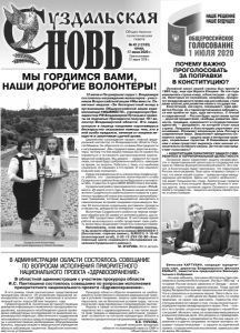 Газета основана 21 марта 1918 г. № 42 (12103) среда, 17 июня 2020 г. Общественно политическая газета НАШЕ РЕШЕНИЕ НАШЕ БУДУЩЕЕ Вячеслав КАРТУХИН, кандидат юридических наук, директор Владимирского филиала РАНХиГС, заместитель председателя Законодательного Собрания: - Не надо забывать, при каких обстоятельствах принималась нынешняя Конституция. Это был 1993 год – в то время России сильно зависела от Запада – экономически, политически, идеологически. Тогда прогиб перед Западом был важнее национальных интересов. Что и отразилось в основном законе. Такого быть точно не должно – у себя дома мы будем жить по своим правилам, не нужно нам диктовать. Главенство Конституции вовсе не говорит о том, что мы полностью игнорируем нормы международного права. Речь – только о тех случаях, когда они идут вразрез с нашей Конституцией. Мы всего лишь не позволяем вмешиваться в наши внутренние дела. Это разумно и справедливо. Тема свободы и независимости России нашла отражение и в других поправках, которые эксперты называют патриотическими – о защите исторической памяти, о патриотическом воспитании, праве россиян на жизнь без войны. 12 июня в Патриарших садах г. Владимира состоялось награждение волонтеров - участников Всероссийской акции #Мы вместе. Памятные медали «За бескорыстный вклад в организацию Общероссийской акции взаимопомощи #МЫВМЕСТЕ», учрежденную Президентом РФ Владимиром Путиным и грамоты за подписью Президента получил 101 волонтер Владимирской области. Это люди, которые в период пандемии коронавируса бескорыстно оказывали помощь тем, кто в ней особо нуждался, начиная от покупки лекарств и заканчивая сдачей крови. Церемонию награждения провел главный федеральный инспектор по Владимирской области Сергей Мамеев. Он обратился со словами благодарности к награждаемым: «Мы гордимся вами, дорогие волонтеры, потому что без вашей помощи мы не сумели бы справиться и остановить распространение коронавирусной инфекции. Мы думали — найдутся ли такие люди, которые будут добровольно работать, невзирая на время, на затраты. Работать с теми, кто наиболее социально не защищен в это время. И они нашлись! Спасибо вам огромное!». Среди награжденных есть и волонтеры Суздальского района, это - руководитель волонтерского штаба Суздальского района Анастасия Барынина и активист штаба, студентка 3 курса ВЮИ ФСИН Олеся Китаева. Суздальский район присоединился к акции «#МыВместе» 25 марта этого года. В рамках акции активные жители Суздальского района разного возраста и различных профессий помогали пожилым и маломобильным гражданам, которые вынужденно находились в самоизоляции во время пандемии коронавируса. Более 30 волонтеров-суздальцев доставляли продукты и лекарства, дежурили на телефонах «горячей линии». Волонтеры Суздальского района за период пандемии обработали 20 заявок от жителей района, доставили 650 продуктовых наборов. В настоящее время работа волонтерского штаба продолжает свою работу, волонтеры продолжают помогать пожилым людям. Напоминаем, если вам необходима помощь, то вы можете обратиться по номеру 88002003411 (бесплатная «горячая линия»), 8(49231) 2-18-42 (волонтерский штаб), 2-52-12 (ГКУ СО ВО «Комплексный центр социального обслуживания населения Суздальского района»). М. ЕГОРОВА. Фото автора. МЫ ГОРДИМСЯ ВАМИ, НАШИ ДОРОГИЕ ВОЛОНТЕРЫ! Суздальские волонтеры Ана