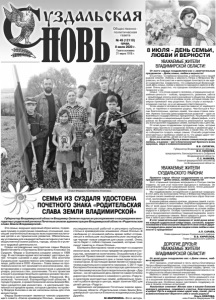 Газета основана 21 марта 1918 г. № 49 (12110) среда, 8 июля 2020 г. Общественно политическая газета От всего сердца поздравляем вас с замечательным праздником – Днём семьи, любви и верности! Его истоки – в глубоком прошлом, и связаны они с нашей родной землёй. Любовь и верность Петра и Февронии Муромских, их благочестие и милосердие почитаются как идеал супружества. Символично, что современный Всероссийский День семьи, любви и верности зародился именно в Муроме. Очень радостно, что праздник полюбился россиянам, прижился у нас. Семья – это опора каждого человека, а традиционные семейные ценности – любовь, преданность, уважение, забота – незыблемые оплоты всего российского общества. Именно в семье ребёнок учится основам основ, которые своим примером прививают ему родители. Быть отцом и матерью – огромное счастье, но и не меньшая ответственность. Успех каждого человека во многом зависит от надёжного тыла, от терпения и понимания родных. Чем больше в России благополучных, крепких семей, тем наша страна сильнее. Именно поэтому демографическое развитие – один из важнейших государственных приоритетов. На решение этих задач нацелен и национальный проект «Демография», в его рамках во Владимирской области реализуются программы всесторонней поддержки семей, материнства и детства. От всей души поздравляем супружеские пары, которые через годы пронесли и сохранили любовь и уважение друг к другу. Желаем счастья молодожёнам, а также тем, кто только собирается создать новую семью. Спасибо родителям многодетных и приёмных семей за то, что щедро дарят тепло своей души детям, делая их счастливыми. Дорогие земляки! Пусть в ваших семьях всегда царит любовь, а в домах – уют и благополучие! Крепкого всем здоровья, мира и взаимопонимания! В.В. СИПЯГИН, Губернатор Владимирской области. В.Н. КИСЕЛЁВ, председатель Законодательного Собрания Владимирской области. С.С. МАМЕЕВ, Главный федеральный инспектор по Владимирской области. УВАЖАЕМЫЕ ЖИТЕЛИ ВЛАДИМИРСКОЙ ОБЛАСТИ! ДОРОГИЕ ДРУЗЬЯ! УВАЖАЕМЫЕ ЖИТЕЛИ ВЛАДИМИРСКОЙ ОБЛАСТИ! УВАЖАЕМЫЕ ЖИТЕЛИ СУЗДАЛЬСКОГО РАЙОНА! Это семьи, ведущие здоровый образ жизни, подающие пример в укреплении семейных отношений, вносящие значительный вклад во всестороннее воспитание детей и их гармоничное развитие. Обязательными условиями для кандидатов было активное участие в общественной жизни района, города, области и успехи в трудовой деятельности. Среди награжденных многодетная семья Федора Валентиновича и Екатерины Викторовны Кноковых из Суздаля. Федор и Екатерина создали семью в 1999 году. В настоящее время воспитывают шестерых детей: четырех сыновей и двух дочерей. Оба окончили Суздальское художественно-реставрационное училище, работали в ООО «Канонъ». Глава семьи на протяжении многих лет занимается иконописанием, проектированием и созданием иконостасов и церковной утвари, росписью стен, золочением. По его проектам и под его руководством было сделано множество иконостасов и киотов во Владимирской, Рязанской, Московской, Читинской, Екатеринбургской областях. В городе Суздале, в храме Казанской иконы Божией Матери находятся два иконостаса - в центральной трапезной и в приделе храма, которые сделаны по проекту Федора Кнокова и им же написаны иконы для этих иконостасов. Федор Валентинович является членом управляющего совет