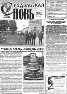 Газета основана 21 марта 1918 г. № 60 (12121) пятница, 14 августа 2020 г. Общественно политическая газета *Акция проходит с 5.08 по 10.10.2020 г. ИП Щанникова Л.Ю. ОГРН 320332800029030 от 30.07.2020 г. Реклама. ИП Щанникова Л Ю дит с 5 08 по 10 10 2020 г Все виды стрижек, укладки, оформление бороды и усов, удаление нежелательных волос на лице полимерным воском. Окрашивания. Для педагогов, школьников, студентов - скидка на стрижки в августе и сентябре*. Ждем вас по адресу: г. Суздаль, ГК «Пушкарская слобода», ул. Ленина, 45 (спа-центр). Телефон 8 919 004 28 02, Лариса. ПАРИКМАХЕРСКАЯ В ГК «ПУШКАРСКАЯ СЛОБОДА» ПРИГЛАШАЕТ ! На днях в Суздале определили лауреатов городской премии в области культуры, искусства и литературы имени Алексея Варганова, ежегодно вручаемой особо отличившимся организациям и творчески одаренным согражданам уже 13 лет. На этот раз лауреатами-2020 стали Суздальский филиал Санкт-Петербургского государственного института культуры и руководитель студии церковного золотого шитья «Суздальские златошвеи» Мария Побережнюк. Городская комиссия, рассмотрев все имеющиеся кандидатуры, сделала правильный выбор. Местный филиал СПбГИК в прошлом году отметил свое 40-летие: бывшее реставрационное училище, слава о котором — а точнее, о мастерстве его выпускников, гремела по всему Советскому Союзу, к началу 2000-х сформировав крепкий преподавательский состав, сумело сегодня приумножить традиции благодаря поддержке головного вуза. А ведь был момент, когда училище находилось на грани закрытия. И признание многолетних творческих заслуг коллектива вуза, возглавляемого вот уже 20 лет кандидатом педагогических наук Маргаритой Виткиной, видится вполне своевременным. Выпускники всех направлений, которые сегодня преподаются в Суздальском филиале, востребованы не только в России, но и в странах ближнего и дальнего зарубежья. Многолетний кропотливый труд всегда приносит хорошие плоды. Второй лауреат, руководитель златошвейной студии Мария Евгеньевна Побережнюк, тоже труженица. Уже не первый год она приобщает в Суздале людей к необычному виду творчества — согласитесь, традиции монастырского золотного шитья сохранить, воспроизвести, да еще и передать другим сегодня не просто. Здесь в 2012 году она создала студию под названием «Суздальские златошвеи». И не только насельницы здешних монастырей, но и студенты вышеупомянутого филиала СПбГИК, и знатоки русских костюмов также приходили и продолжают приходить к ней на занятия. Студия часто участвовала в различных выставках и стала довольно известна. Сегодня воспитанники Марии Побережнюк занимаются в Центре народного творчества, изучая различные приемы и техники шитья, историю древнего искусства. Заметим, что кандидатуру руководителя студии «Суздальские златошвеи» поддержало Суздальское отделение ВОО ВООПИиК — за популяризацию искусства древнего шитья в городе и районе. Г.ДЖУЛАЕВ ЛАУРЕАТАМИ ПРЕМИИ ИМЕНИ А.ВАРГАНОВА СТАЛИ РЕСТАВРАЦИОННЫЙ ВУЗ И ЗЛАТОШВЕЯ ГОРЯЧАЯ ЛИНИЯ ОМБУДСМЕНА ДЛЯ ПРИЁМА СООБЩЕНИЙ О НАРУШЕНИИ ИЗБИРАТЕЛЬНЫХ ПРАВ ГРАЖДАН Уполномоченный по правам человека во Владимирской области информирует об открытии «горячей линии» для приёма сообщений о нарушении избирательных прав граждан. С 13 августа по 14 сентября информацию о нарушении Ваших избирательных прав можно сообщить по телефонам: - 8 900 478 00 33 (внимание: звонок платн