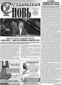 Газета основана 21 марта 1918 г. № 66 (12127) пятница, 4 сентября 2020 г. Общественно политическая газета *Акция проходит с 5.08 по 10.10.2020 г. ИП Щанникова Л.Ю. ОГРН 320332800029030 от 30.07.2020 г. Реклама. ИП Щанникова Л Ю дит с 5 08 по 10 10 2020 г Все виды стрижек, укладки, оформление бороды и усов, удаление нежелательных волос на лице полимерным воском. Окрашивания. Для педагогов, школьников, студентов - скидка на стрижки в августе и сентябре*. Ждем вас по адресу: г. Суздаль, ГК «Пушкарская слобода», ул. Ленина, 45 (спа-центр). Телефон 8 919 004 28 02, Лариса. ПАРИКМАХЕРСКАЯ В ГК «ПУШКАРСКАЯ СЛОБОДА» ПРИГЛАШАЕТ ! 26 августа состоялось очередное заседание Совета народных депутатов Суздальского района. Депутаты рассмотрели 10 вопросов повестки дня. Традиционно первый блок вопросов касался бюджета Суздальского района: за 2019 и текущий годы. В начале с заключением по результатам внешней проверки годового отчета об исполнении бюджета муниципального образования Суздальский район за 2019 год познакомила собравшихся И.А. Анисина, начальник контрольно-счетного отдела Совета народных депутатов Суздальского района. В ходе внешней проверки проанализированы нормативные правовые акты, регулирующие бюджетный процесс в муниципальном образовании, в том числе по формированию и исполнению местного бюджета в анализируемом периоде, а также бюджетная отчетность главных администраторов бюджетных средств. Как отметила И.А. Анисина, в целом проведенная внешняя проверка позволяет сделать вывод о достоверности бюджетной отчетности как носителя информации о финансовой деятельности главных администраторов бюджетных средств. Доходная часть бюджета Суздальского района в 2019 году исполнена в сумме 1 338 881, 3 тыс. руб., что составляет 99,7 % от утвержденных плановых назначений и 136,4 % к уровню доходов за 2018 год. Налоговые и неналоговые доходы исполнены в сумме 303 759, 1 тыс. руб. (101,4 % от плановых назначений на год). Согласно отчету об исполнении бюджета расходы исполнены в сумме 1 327 686,9 тыс. руб. или на 97,9 % от плановых бюджетных назначений. По отношению к уровню 2018 года расходы бюджета увеличены на 35,2 %. В результате исполнения бюджета сложился его профицит в размере 11 194,4 тыс. руб. или 3,7 % от общего годового объема доходов местного бюджета без учета утвержденного объема безвозмездных поступлений и (или) поступлений налоговых доходов по дополнительным нормативам отчислений. С обстоятельным докладом об исполнении бюджета Суздальского района за 2019 год выступил С.А. Белов, заместитель Главы администрации района, начальник управления по экономике и финансам администрации Суздальского района. Он же информировал депутатов о внесенных изменениях и дополнениях в бюджет района на текущий год. Доходную часть бюджета предложено увеличить на общую сумму 19 731 тыс. рублей, расходы увеличить на эту же сумму. Таким образом, Совету были предложены к утверждению следующие показатели бюджета на 2020 финансовый год: доходная часть бюджета в объеме 1 млрд. 94 млн. 230 тыс. руб., расходы бюджета 1 млрд. 112 млн. 552,6 тыс. руб. и дефицит бюджета 18 млн. 322,6 тыс. рублей. Депутаты единогласно проголосовали за внесение изменений и дополнений в решение Совета народных депутатов Суздальского района от 25.12.2019 года № 32 «О бюджете Суздальского района на 2020 год и на плановый период 2021 и 2022 годов». Народные избранники утвердили Порядок принятия решения о