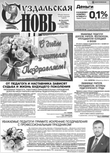 Газета основана 21 марта 1918 г. № 76 (12137) пятница, 2 октября 2020 г. Общественно политическая газета Реклама Примите самые тёплые поздравления с вашим профессиональным праздником! Учитель — это не просто профессия, это призвание. Это редкий и прекрасный талант. Педагог дает необходимый багаж знаний ученикам, прививает тягу к самообразованию. Как наставник, учитель помогает воспитаннику развить лучшие качества, найти свое профессиональное предназначение. Благодарю вас за огромный труд, за преданность профессии, мудрость, терпение, веру в своих учеников и готовность всегда прийти им на помощь. Искренне поздравляю с Днём учителя! Желаю вам новых творческих достижений, уверенности в своих силах, здоровья и семейного благополучия, а также благодарных и целеустремленных учеников! ВСЕГО ВАМ САМОГО ДОБРОГО! С уважением, сенатор Российской Федерации Ольга ХОХЛОВА. УВАЖАЕМЫЕ ПЕДАГОГИ! ДОРОГИЕ УЧИТЕЛЯ, ВОСПИТАТЕЛИ, ПРЕПОДАВАТЕЛИ КОЛЛЕДЖЕЙ И ВУЗОВ! УВАЖАЕМЫЕ УЧИТЕЛЯ, ПРЕПОДАВАТЕЛИ, ВЕТЕРАНЫ ПЕДАГОГИЧЕСКОГО ТРУДА! От всего сердца поздравляю вас с профессиональным праздником! В этом году вы встречаете его в особых условиях из-за пандемии COVID-19. Хочу выразить искреннее восхищение тем, как чётко и оперативно вы сориентировались в экстремальной ситуации, вашей чрезвычайной работоспособностью и профессионализмом. Вы показали самый лучший пример своим ученикам, помогли им перестроиться на новые формы работы, поддержали во всём. Выражаю всем вам огромную благодарность за результативный труд. Учитель для ребёнка – самый важный взрослый человек после родителей. В каждом вы растите личность, направляете, воспитываете достойных граждан нашего Отечества. Спасибо вам за то, что раскрываете лучшие качества в каждом ребёнке, за душевное тепло, внимание и искреннюю заботу о самом дорогом, что у нас есть, – наших детях. Уважаемые педагоги! Желаю вам исполнения всех ваших планов и надежд, благодарных учеников, поддержки в коллективе, новых успехов в работе, мира, любви, достатка и счастья в семье! Радостного и доброго праздника всем вам! В.В. СИПЯГИН, Губернатор области. ОТ ПЕДАГОГА И НАСТАВНИКА ЗАВИСЯТ СУДЬБА И ЖИЗНЬ БУДУЩЕГО ПОКОЛЕНИЯ Примите самые искренние поздравления с вашим профессиональным праздником – с Днем учителя! Школьные годы оставляют в сердце каждого немало добрых, пронизанных светом и теплом воспоминаний. От первого звонка и до выпускного бала нас бережно опекают и наставляют наши педагоги. От педагога и наставника, его профессиональных и человеческих качеств во многом зависят судьба и жизнь будущего поколения, завтрашний день страны. В системе образования Суздальского района немало интересных педагогических коллективов, незаурядных, творческих и влюбленных в свое дело людей. Дорогие наши педагоги! Благодаря вашему профессионализму, любви к своему делу и людям формируются этические, эстетические представления и ориентиры детей. Перед современным образованием стоит непростая задача – не только научить, но и максимально раскрыть талант ребенка. Этому способствуют инновации в работе, современное оборудование, освоение самых последних методик. В условиях пандемии на вас легла дополнительная ответственность, требующая концентрации сил, организаторских способностей, выдержки и огромного терпения. Выражаем вам искреннюю призн