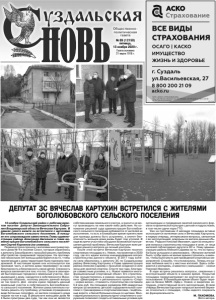 Газета основана 21 марта 1918 г. № 89 (12150) пятница, 13 ноября 2020 г. Общественно политическая газета 10 ноября Суздальский район с рабочим визитом посетил депутат Законодательного Собрания Владимирской области Вячеслав Картухин. В рамках своего визита он встретился с жителями Боголюбовского сельского поселения. В поездке его сопровождали заместитель Главы администрации района Александр Авсеенок и глава администрации Боголюбовского сельского поселения Сергей Корнилов (на снимках). Первая встреча прошла с жителями многоквартирного дома № 4 в поселке Сокол, которые обратились к депутату Заксобрания с просьбой решить проблему обустройства придомовой территории. На протяжении нескольких лет жильцы дома борются за то, чтобы прилегающая к дому территория была признана придомовой. В настоящее время она используется как проезжая часть и жители дома переживают за свою безопасность и безопасность своих детей. Сложность вопроса заключается в том, что пос. Сокол в свое время был военным городком и земельный участок, примыкающий к дому, находится в собственности Министерства обороны, поэтому решить данный вопрос не так просто. Для начала нужно передать данный земельный участок в собственность Боголюбовского сельского поселения. Жители самостоятельно пытались решить эту проблему, установив ограждения в виде бетонных полусфер, но жители соседнего дома подали на них в суд. В результате жильцами дома № 4 были проиграны два суда, так как они не являются собственниками земельного участка, а значит и не могут производить на нем какие-либо действия. На основании решений суда администрация Боголюбовского сельского поселения добивается от жителей их исполнения, то есть в ближайшее время препятствия для проезда должны быть устранены, а значит безопасность жильцов дома вновь будет под угрозой. В ходе встречи участники обсудили возможные пути решения данной проблемы. Вячеслав Картухин взял решение данного вопроса на личный контроль. После этой встречи Вячеслав Картухин посетил спортивную площадку в с. Новое, построенную в 2020 году, где его ждали жители инициировавшие вопрос строительства данного объекта. В 2017 году жители села обратились к депутату ЗС по Суздальскому району Вячеславу Картухину и Главе администрации района Алексею Сараеву с просьбой создания в селе зоны для занятий спортом. Спустя три года, благодаря совместным усилиям, в с. Новое появился многофункциональный спортивный объект. Его строительство осуществлялось в рамках национального проекта «Демография» и регионального проекта «Спорт – норма жизни», стоимость строительства составила 5,9 млн.руб. На площадке размером 800 квадратных метров установлены детский оздоровительный комплекс с тренажерами и спорткомплексами, гандбольные ворота и баскетбольные кольца со щитами. Многофункциональность физкультурно-спортивного сооружения позволяет создать оптимальные условия для организации и проведения занятий различного формата по физической культуре с детьми и подростками, в том числе сдачи норм ГТО. Уже на протяжении 2 месяцев площадка активно используется жителями села и Вячеслава Картухина, в первую очередь, интересовали вопросы, связанные с ее эксплуатацией, довольны ли жители данным объектом. Редькин Николай Иванович, один из инициаторов вопроса строительства площад