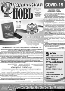 Газета основана 21 марта 1918 г. № 98 (12159) пятница, 11 декабря 2020 г. Общественно политическая газета Реклама Конституция является гарантией гражданских прав и свобод, независимости и целостности России. Неизменным Основной закон оставался более четверти века. За это время страна окрепла, заслужила международный авторитет. И в этом году произошло поистине историческое событие: Конституция претерпела целый ряд концептуальных изменений в духе национальных приоритетов. Теперь в ней закреплены ценностные ориентиры нашего народа и конкретные социальные обязательства государства перед своими гражданами. На первый план выходят справедливость и достойная жизнь. Важно, чтобы каждый житель Владимирской области, как и все граждане России, ощущал реальную заботу государства. Опираясь на созданный Конституцией правовой и ценностный фундамент, мы продолжаем реализацию национальных проектов, направленных на динамичное социально-экономическое развитие страны, повышение уровня жизни населения, создание условий для самореализации и раскрытия таланта каждого человека. Уверены, что ориентируясь на созидательные принципы, утверждённые Основным законом, мы сможем сделать наш регион процветающим и комфортным. Вместе мы добьёмся самых амбициозных целей! В День Конституции России от души желаем всем жителям области крепкого здоровья, мира и благополучия, профессиональных успехов на благо Отечества! УВАЖАЕМЫЕ ЖИТЕЛИ ВЛАДИМИРСКОЙ ОБЛАСТИ! УВАЖАЕМЫЕ СУЗДАЛЬЦЫ! В.В.СИПЯГИН, Губернатор Владимирской области. В.Н. КИСЕЛЁВ, председатель Законодательного Собрания Владимирской области. С.С. МАМЕЕВ, главный федеральный инспектор по Владимирской области. Примите наши искренние поздравления с Днём Конституции Российской Федерации – одним из главных государственных праздников страны. От имени администрации и Совета народных депутатов Суздальского района поздравляем вас с одним из главных государственных праздников нашей страны - Днём Конституции Российской Федерации! Принятый 12 декабря 1993 года на всенародном референдуме Основной Закон нашей страны стал прочным фундаментом для развития суверенного государства. В этом году мы голосовали за поправки в Конституцию, которые укрепили независимость страны, традиционные семейные ценности, права и свободы граждан. Россияне сделали свой выбор в пользу стабильности и устойчивости политической системы, сохранения культурных традиций, социальных гарантий. Уважаемые земляки! Отмечая эту дату, давайте помнить о том, что только совместными усилиями мы сможем решить стоящие перед нами задачи по укреплению государственности, подъему экономики, повышению благосостояния людей и стабильности в обществе. Пусть на этом пути всем нам сопутствуют удача и успех. Примите искренние пожелания крепкого здоровья, личного счастья и успехов во всех добрых начинаниях на благо нашей Суздальской земли и Отечества! А.П. САРАЕВ, Глава администрации Суздальского района. В.В. КИРИЛЛОВ, Глава Суздальского района. Напоминаю вам, что на территории Владимирской области продолжают действовать масочный режим в общественных местах и режим самоизоляции для людей старше 65 лет. Режим самоизоляции предусматривает преимущественное нахождение дома, перевод на дистанционную работу или оформление больничного листа. Выходить из дом