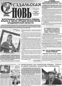 Газета основана 21 марта 1918 г. № 99 (12160) среда, 16 декабря 2020 г. Общественно политическая газета 1 декабря 2020 года истек срок уплаты имущественных налогов (земельного, транспортного и налога на имущество физических лиц), начисленных за 2019 год. Всех, кто не уплатил налоги, просим срочно уплатить. По всем вопросам необходимо обратиться в территориально обособленное рабочее место Межрайонной инспекции Федеральной налоговой службы России № 10 по Владимирской области в городе Суздале по адресу: г. Суздаль, Красная площадь, д.1, 3-й этаж, контактный телефон 2-12-61. Администрация города Суздаля. Владимирский Инвестиционный Конгресс-2020 будет проходить в течение пяти рабочих дней 15, 16, 18, 21 и 22 декабря. В его мероприятиях примут участие Губернатор Владимир Сипягин, ведущие предприниматели Владимирской области, федеральные эксперты и политики. Основные цели конгресса: презентовать потенциальным российским и иностранным инвесторам, инвестиционным и венчурным фондам инвестиционную привлекательность Владимирской области, региональные меры поддержки и институты развития для бизнеса, инвестиционные проекты и площадки; показать уже реализованные успешные крупные инвестпроекты в регионе; установить прямые контакты с ведущими российскими и международными ассоциациями бизнеса, фондами и институтами развития. В рамках конгресса будут работать 12 тематических секций, посвящённых разным сферам инвестиционной деятельности: федеральные и региональные меры поддержки инвесторов; площадки для инвесторов ОЭЗ, ТОСЭР, индустриальные парки; экспорт и международная инвестиционная деятельность; инвестиции в промышленность, туризм и сельское хозяйство; лучшие региональные практики. Они будут проводиться в комбинированном формате, организованы студии для спикеров в Москве, Владимире и Доброграде. Трансляция секций будет вестись на официальном портале конгресса – vladimirinvest.ru. Свое приветствие участникам конгресса прислали Денис Мантуров, Министр промышленности и торговли Российской Федерации, и Максим Решетников, Министр экономического развития Российской Федерации. Пресс-служба администрации Владимирской области. 15 ДЕКАБРЯ СТАРТОВАЛ ВЛАДИМИРСКИЙ ИНВЕСТИЦИОННЫЙ КОНГРЕСС- 2020 ВО ВЛАДИМИРСКОЙ ОБЛАСТИ ПО 27 ДЕКАБРЯ ПРОДЛЕВАЕТСЯ РЕЖИМ САМОИЗОЛЯЦИИ ДЛЯ ГРАЖДАН СТАРШЕГО ВОЗРАСТА УВАЖАЕМЫЕ ЖИТЕЛИ ГОРОДА СУЗДАЛЯ! ВСЕ, КТО НЕ УПЛАТИЛ НАЛОГИ, СРОЧНО УПЛАТИТЕ! базе МКУК «Павловский КДЦ» с. Борисовское. Сфера её добровольческой деятельности – экологическое, социальное, патриотическое направления, организация массовых мероприятий. Наталья Мотина с 2010 года является организатором эколого-благотворительного проекта «Посади дерево», акции «Чистые улицы», которые в последствии стали ежегодными. При её активном участии на территории школы проходили благотворительная акция «Добрые крышечки», в ходе которой их было собрано около 50 кг, а также акция «Сдай макулатуру – спаси дерево», в рамках которой сдано на переработку более 400 кг макулатуры. С учащимися МБОУ «Садовая СШ» она ежегодно проводит благотворительную акцию «Подарок ветерану», участвует в художественной самодеятельности Дома культуры с. Борисовское, выезжая с благотворительной концертной программой в пансионат п. Садовый. Совместно с работниками Дома культуры организована акция «Праздник в ка