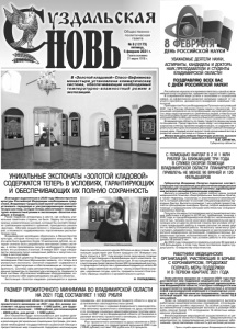 Газета основана 21 марта 1918 г. № 8 (12173) пятница, 5 февраля 2021 г. Общественно политическая газета Российская наука во все времена являлась одной из важнейших опор государства, предметом гордости всей страны. В современном мире успехи в экономике и социальной сфере, их эффективное развитие напрямую зависят от научного прогресса, динамичного внедрения новейших технологий. Президентом России Владимиром Путиным наступивший 2021 год в России объявлен Годом науки и технологий. Это решение направлено на популяризацию научной деятельности, ведь наука начинается с увлечённых людей, и чем больше наша молодёжь будет увлечена научной деятельностью, тем мощнее будет потенциал технологического развития страны. Владимирская область по праву гордится своим научным потенциалом. Представители науки ведут исследования по широкому спектру проблем модернизации, в содружестве с реальным сектором экономики реализуют смелые инновационные идеи. Каждый из вас вносит свой неоценимый вклад в развитие нашего региона и страны в целом. Желаю вам дальнейших творческих успехов, высоких результатов, крепкого здоровья и благополучия! В.В. СИПЯГИН, Губернатор области. УВАЖАЕМЫЕ ДЕЯТЕЛИ НАУКИ, АСПИРАНТЫ, КАНДИДАТЫ И ДОКТОРА НАУК,ПРЕПОДАВАТЕЛИ И СТУДЕНТЫ ВЛАДИМИРСКОЙ ОБЛАСТИ! РАБОТНИКИ МЕДИЦИНСКИХ ОРГАНИЗАЦИЙ, УЧАСТВУЮЩИЕ В БОРЬБЕ С КОРОНАВИРУСОМ, ПРОДОЛЖАТ ПОЛУЧАТЬ МЕРЫ ПОДДЕРЖКИ И В ПЕРВОМ КВАРТАЛЕ 2021 ГОДА РАЗМЕР ПРОЖИТОЧНОГО МИНИМУМА ВО ВЛАДИМИРСКОЙ ОБЛАСТИ НА 2021 ГОД СОСТАВЛЯЕТ 11093 РУБЛЯ С ПОМОЩЬЮ ВЫПЛАТ В 2 И 1 МЛН РУБЛЕЙ ЗА БЛИЖАЙШИЕ ТРИ ГОДА В СЛУЖБУ СКОРОЙ ПОМОЩИ ВЛАДИМИРСКОЙ ОБЛАСТИ ПЛАНИРУЕТСЯ ПРИВЛЕЧЬ НЕ МЕНЕЕ 90 ВРАЧЕЙ И 120 ФЕЛЬДШЕРОВ ПОЗДРАВЛЯЮ ВСЕХ ВАС С ДНЁМ РОССИЙСКОЙ НАУКИ! Глава региона продлил на 1 квартал 2021 года предоставление мер поддержки медицинским и иным работникам государственных учреждений здравоохранения Владимирской области, в которых планируется или осуществляется профилактика, диагностика и лечение новой коронавирусной инфекции в стационарных условиях, в части обеспечения их проживанием, питанием и питьевой водой. На эти цели направляется около 18,9 млн рублей. Также на трёхмесячный период сохраняются выплаты работникам вышеперечисленных учреждений, относящимся к категории прочего персонала. За особые условия труда ежемесячные стимулирующие выплаты в размере 8361 рубль получат более 170 сотрудников 16 областных медицинских учреждений. Финансирование мероприятий осуществляется из резервных средств областного бюджета, предусмотренных на мероприятия по предупреждению распространения заболеваний, представляющих опасность для жителей региона. Пресс-служба администрации Владимирской области. Губернатор Владимир Сипягин подписал соответствующее постановление для обеспечения медицинских организаций государственной системы здравоохранения региона квалифицированными кадрами. Выплату в размере 2 млн рублей получат врачи скорой медицинской помощи общепрофильных выездных бригад, а также педиатры, психиатры и анастезиологи-реаниматологи, которые работают в составе специализированных выездных бригад. Выплата в размере 1 млн рублей предоставляется фельдшерам выездных бригад скорой медицинской помощи и медицинским сёстрам-анестезистам специализированных бригад. Получить эти меры господдержки могут вышеперечисл
