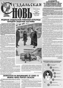 Газета основана 21 марта 1918 г. № 9 (12174) среда, 10 февраля 2021 г. Общественно политическая газета В режиме видеоконференции состоялось очередное заседание оперативного штаба по предупреждению завоза и распространения новой коронавирусной инфекции под председательством Главы администрации Суздальского района А.П.Сараева. В нем приняли участие главы администраций городского и сельских поселений, заместители Главы администрации района, представители Управления Роспотребнадзора по Владимирской области, Суздальской районной больницы, ОМВД России по Суздальскому району, руководители подразделений районной администрации. А.П.Сараев начал заседание с информации о заседании областного оперативного штаба, довел до участников заседания основные показатели по распространению коронавирусной инфекции. О текущей санитарно-эпидемиологической ситуации в Суздальском районе заслушали А.Л.Аверьянову, главного специалиста-эксперта Управления Роспотребнадзора во Владимирской области. Она обратила внимание на рост заболеваемости коронавирусной инфекцией среди детей, посещающих дошкольные учреждения, и учащихся школ. Продолжается рост заболеваемости ОРВИ как среди взрослого, так и среди детского населения. О.А.Логинова, и.о. главного врача ГБУЗ ВО «Суздальская районная больница» проинформировала о ходе вакцинации на территории Суздальского района. С 22 января начата массовая вакцинация населения против коронавирусной инфекции. 30 января вакцинация была временно приостановлена в связи с использованием полученного количества вакцины «СпутникV» (400 доз). С 5 февраля прививочная кампания продолжена. И.о. главного врача также отметила, что Суздальская районная больница работает в обычном режиме, функционируют все отделения. Продолжаются проверки предприятий по соблюдению требований Роспотребнадзора. С итогами проверок участников заседания познакомил С.А.Белов, заместитель Главы администрации Суздальского района. В период с 25 января по 2 февраля проведены рейды на предмет соблюдения персоналом предприятий автомобильного транспорта и пассажирами общественного транспорта требований комплекса противоэпидемиологических мер. Проверено 12 транспортных средств, выявлено 6 нарушений. Составлены 2 административных протокола на водителей такси, которые находились без средств индивидуальной защиты. С 25 января по 2 февраля проведены проверки 152 объектов торговли и 18 предприятий общественного питания всех муниципальных образований. На особом контроле Главы администрации района А.П.Сараева ситуация с заболеваемостью в образовательных и дошкольных учреждениях района. Занятия в школах и организациях дополнительного образования по прежнему проходят в очном режиме. В целях предотвращения и нераспространения новой коронавирусной инфекции продолжаются мероприятия по дезинфекции объектов и территорий. Ежедневно в УГО и ЧС Суздальского района поступают сведения о местонахождении заболевших новой коронавирусной инфекцией и информация направляется главам администраций городского и сельских поселений для организации проведения работ по дезинфекции. Для проведения дезинфекции на территории Суздальского района создано 7 мобильных групп, кроме того, к работе по дезинфекции привлекаются управляющие компании, ТСЖ, ТСН, 4 крупные управля