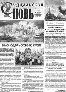 Газета основана 21 марта 1918 г. № 10 (12175) пятница, 12 февраля 2021 г. Общественно политическая газета Время летит быстро. 15 февраля 2021 года исполнится уже 32 года, как советские войска покинули Афганистан. По случаю памятной даты вывода наших войск из ДРА воины-интернационалисты из Суздальского района соберутся в Суздале у памятника своим сотоварищам, погибшим в Афганистане и в Чечне — встреча намечена на пятницу, 12 февраля, в 11 часов (во дворе индустриальногуманитарного колледжа). Как известно, военную службу в составе ограниченного контингента прошли свыше 600 тысяч военнослужащих и около 21 тысячи рабочих и служащих на гражданских должностях. За успешное выполнение заданий военного командования с января 1980 года по февраль 1989-го были награждены государственными наградами 205 тысяч 863 человека, а 73 военнослужащим присвоено звание Героя Советского Союза. 170 воинов-интернационалистов были призваны из Суздальского района, четверо воинов погибли. А всего из Владимирской области были призваны и отправлены на службу в ДРА более 3 тысяч солдат и офицеров. По официальным данным, 98 из них погибли и 180 были ранены. 116 человек стали инвалидами, посмертно получили государственные награды 69 жителей Владимирской области. О них не забывают люди, и хотя ветеранов той войны остается всё меньше, они востребованы в школах, заменив по сути ветеранов Великой Отечественной войны на традиционных Уроках мужества. В Суздальском районе вообще сложилась хорошая традиция. Каждый год воины-интернационалисты с представителями администрации района посещают могилы воинов-земляков, погибших в Афганистане и Чечне. Вас помнят, ребята!.. ДАВАЙТЕ ПОМНИТЬ О ТЕХ, КТО ЖИЗНЬ ОТДАЛ НА АФГАНСКОЙ ЗЕМЛЕ УВАЖАЕМЫЕ ВОИНЫ-ИНТЕРНАЦИОНАЛИСТЫ, УЧАСТНИКИ БОЕВЫХ ДЕЙСТВИЙ, ВЕТЕРАНЫ ЛОКАЛЬНЫХ КОНФЛИКТОВ СУЗДАЛЬСКОГО РАЙОНА! 15 февраля 1989 года последняя колонна советских войск покинула Афганистан. Ежегодно в этот день мы чтим память воинов, погибших при исполнении служебного долга за пределами Родины. Советские и российские воины участвовали в более чем тридцати локальных войнах и вооруженных конфликтах. Это были разные страны, разные годы и разные поколения, но боль тех, кто терял своих близких товарищей, кто не дождался родных, одинаково велика. Любая война, независимо от ее масштабов и целей, оставляет неизгладимый след в сердцах и душах людей. Не утихает боль невосполнимых потерь. Мужество и героизм наших бойцов не имеют срока давности и во все времена достойны глубочайшего уважения. Уважаемые земляки, участники боевых действий! Благодарим вас за то, что вы с честью выполнили свой интернациональный долг, защищая интересы нашей Родины. От души желаем вам, вашим родным и близким, а также семьям и родственникам погибших воинов здоровья, счастья, мира, добра и благополучия! А.П.САРАЕВ, Глава администрации Суздальского района. В.В. КИРИЛЛОВ, Глава Суздальского района. 15 февраля – День памяти воинов-интернационалистов Безусловно, Суздаль зимой особенно красив! К подобной теме не раз обращались и знаменитые художники и фотографы, поэтому перед юными творцами стояла непростая задача рассказать именно свою сказку. По мнению жюри конкурса и первых посетителей выставки, это им в полной мере удалось. Город с детских картин смотрит на зрителей заснеженными улицами, окнами домов в морозных у