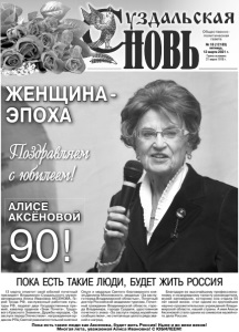 ЖЕНЩИНА - ЭПОХА АЛИСЕ АКСЁНОВОЙ 90! Поздравляем с юбилеем! Газета основана 21 марта 1918 г. № 18 (12183) пятница, 12 марта 2021 г. Общественно политическая газета 13 марта отметит свой юбилей почетный президент Владимиро-Суздальского музеязаповедника Алиса Ивановна АКСЕНОВА, Герой Труда РФ, заслуженный работник культуры РФ, лауреат двух Государственных премий, кавалер орденов «Знак Почета», Трудового Красного Знамени, Дружбы народов, «За заслуги перед Отечеством», награжденная орденом РПЦ Святой равноапостольной княгини Ольги и медалью Святого благоверного князя Даниила Московского, медалью «За заслуги перед Владимирской областью», Почетный доктор Российской академии туризма, Почетный гражданин Владимирской области, города Владимира, города Суздаля, удостоенная почетного знака «За заслуги перед музейным сообществом», не считая еще целого ряда званий и наград. Благодаря ее высочайшему профессионализму и незаурядному таланту руководителя, музей-заповедник, которому она отдала 50 лет своей жизни, стал одним из крупнейших научно-просветительских учреждений Владимирской области, нашей страны. А имя Алисы Аксеновой стало одним из символов музейного дела России. ПОКА ЕСТЬ ТАКИЕ ЛЮДИ, БУДЕТ ЖИТЬ РОССИЯ Пока есть такие люди как Аксенова, будет жить Россия! Ныне и во веки веков! Многая лета, уважаемая Алиса Ивановна! С ЮБИЛЕЕМ!