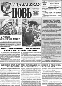 Газета основана 21 марта 1918 г. № 26 (12191) пятница, 9 апреля 2021 г. Общественно политическая газета Так случилось, что Юрия Гагарина судьба не раз сводила с Владимирским краем. Начальную парашютную подготовку он проходил на аэродроме под Киржачом. Руководителем центра подготовки космонавтов в гагаринские времена был легендарный летчик, наш земляк Николай Каманин. Именно здесь, 27 марта 1968 года у деревни Новоселово Киржачского района он трагически погиб вместе с летчиком Владимиром Серегиным во время тренировочного полета самолета МИГ-15...Приходилось бывать первому космонавту и во Владимире , и в древнем Суздале. В Суздале Юрий Гагарин побывал 17 сентября 1963 года. Он посетил воспитательно-трудовую колонию для несовершеннолетних преступников, которая располагалась в СпасоЕвфимиевом монастыре, побывал на экскурсии, которую ему, кстати, провела сама Алиса Ивановна Аксенова. Она тогда еще только начинала свою работу в должности директора музея-заповедника. После посещения Владимира и Суздаля, когда Гагарина спросили понравились ли ему города, он ответил коротко: «Они - замечательные!» Сегодня, уважаемые читатели, мы публикуем воспоминания нашей читательницы В.Е. Устиновой, бывшего преподавателя Суздальского сельхозтехникума, которой довелось присутствовать на той памятной встрече с Юрием Гагариным в Суздале (см. стр. 10). ...Пройдут века, человек полетит на другие планеты, многое сотрется в памяти, но имя Юрия Гагарина, впервые полетевшего в космос, навсегда останется в истории земной цивилизации. Давайте будем об этом помнить и гордиться этим! 12 АПРЕЛЯ - ДЕНЬ КОСМОНАВТИКИ 12 апреля 2021 года исполняется ровно 60 лет со дня первого полета человека в космос. В этот день в 1961 году с космодрома Байконур впервые стартовал космический корабль с первым в истории человечества космонавтом Юрием Гагариным на борту. За этот полет ему было присвоено звание Героя Советского Союза, а 12 апреля стало Днем космонавтики. Идею праздника предложил второй космонавт Герман Титов, в честь первого орбитального полета человека в космос. МЫ - СТРАНА ПЕРВОГО КОСМОНАВТА ЮРИЯ АЛЕКСЕЕВИЧА ГАГАРИНА Юрий Гагарин в Суздале. 1963 г. ПРИЕМ ГРАЖДАН В МЕСТНОЙ ОБЩЕСТВЕННОЙ ПРИЕМНОЙ ПАРТИИ «ЕДИНАЯ РОССИЯ» (в дистанционном формате) ПРИЕМ БУДУТ ВЕСТИ: 12 апреля с 14.00 до 15.00 – САРАЕВ Алексей Петрович, Глава администрации Суздальского района; 14 апреля с 10.00 до 11.00 – ХОХОРИН Юрий Вениаминович, депутат Совета народных депутатов муниципального образования Селецкое по округу № 4; 16 апреля с 10.00 до 11.00 – БЕЛОВ Александр Юрьевич, депутат Совета народных депутатов города Суздаль Суздальского района по округу № 6. Прием проводится дистанционно по телефону 8 (49231) 2-05-17. В администрации Владимирской области состоялось расширенное заседание региональной призывной комиссии. В мероприятии приняли участие врио заместителя Губернатора Григорий Вишневский, врио военного комиссара области Виктор Лебедев. На заседании были подведены итоги призыва в 2020 году и поставлены задачи по организации и проведению призыва граждан на военную службу в регионе в апреле – июле текущего года. Во Владимирской области в ходе призывной кампании 2020 года задание Штаба Западного военного округа по призыву граждан на военную службу выполнено полностью. По итогам комплексных мероприятий, в том числе и призыва, среди 26 