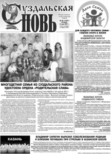 Газета основана 21 марта 1918 г. № 36 (12201) пятница, 14 мая 2021 г. Общественно политическая газета 15 мая отмечается Международный день семьи. Примите самые искренние поздравления с этим замечательным, ещё больше объединяющим самых близких людей праздником! Для любого человека семья – столь же естественная и безусловная ценность, как жизнь и свобода. Она является нашей первой и самой прочной опорой, гаванью, защищающей от невзгод. Здесь мы учимся важнейшим вещам – проявлениям любви, ответственности, взаимопониманию, взаимоуважению, прощению и согласию. В каждом роду живёт и передаётся от старших к младшим бесценное духовно-нравственное и культурное наследие, формируются самые добрые традиции. Заложенные в семье забота о детях, уважение к старикам, преемственность поколений становятся нерушимой основой, на которой стоит здоровое, стабильное общество, могучая и процветающая страна. В этот день особые слова благодарности хочется адресовать многодетным семьям и семьям с приёмными детьми. Широта вашей души, тепло сердец и мудрость понастоящему восхищают. Спасибо вам за искреннюю любовь к детям, нескончаемое терпение и неустанный труд! Мои искренние пожелания счастья молодожёнам! Храните ваши светлые чувства, уважайте и заботьтесь друг о друге! Ничто не укрепляет союз любящих так, как дети, поэтому пусть ваши семьи растут и пусть в ваших домах звучат счастливые детские голоса. Помощь семьям со стороны государства – очень важный аспект. По поручению Президента России разработаны программы помощи молодым, многодетным семьям. В числе первоочередных мер, направленных на улучшение демографической ситуации в стране, предусмотрено расширение объёма гарантированной медицинской помощи, оказываемой женщинам бесплатно в период беременности, родов и в послеродовый период, а также развитие сети современных перинатальных центров. Разрабатываются меры повышения занятости женщин с малолетними детьми, организации их профессиональной подготовки и переподготовки, внедрению гибких режимов работы. Дорогие земляки! Цените и берегите свои семьи! Храните домашний уют и тепло, мир и взаимопонимание, любите друг друга, дарите радость, цените каждое мгновение, проведённое вместе. Желаю вам мира в кругу близких людей, достатка и благополучия! В.В. СИПЯГИН, Губернатор области. УВАЖАЕМЫЕ ЖИТЕЛИ ВЛАДИМИРСКОЙ ОБЛАСТИ! УВАЖАЕМЫЕ ЖИТЕЛИ СУЗДАЛЬСКОГО РАЙОНА! ВЛАДИМИР СИПЯГИН ВЫРАЗИЛ СОБОЛЕЗНОВАНИЯ РОДНЫМ И БЛИЗКИМ ПОГИБШИХ ПРИ СТРЕЛЬБЕ В КАЗАНСКОЙ ШКОЛЕ Евгений Александрович и Татьяна Сергеевна воспитывают девятерых детей, пятерым из которых ещё нет 18-ти лет. Семёновы живут в посёлке Боголюбово Суздальского района. Здесь хорошо знают эту дружную и активную семью. Евгений Александрович – общественный активист в области воспитания подрастающего поколения. Он состоит в Союзе десантников России, является членом Общероссийского движения «Россия Православная», Владимирского отделения Всероссийской общественной организации ветеранов «Боевое братство», а также внештатным сотрудником полиции ОМВД России по Суздальскому району. Семёнов проводит в образовательных учреждениях региона Уроки мужества и патриотические лекции. Неоднократно он отмечался наградами за вклад в развитие военно-патриотического воспитания молодёжи. Трудится отец большого семе