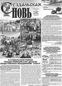 Газета основана 21 марта 1918 г. № 40 (12205) пятница, 28 мая 2021 г. Общественно политическая газета УВАЖАЕМЫЕ ВЕТЕРАНЫ И РАБОТНИКИ БИБЛИОТЕЧНОЙ СИСТЕМЫ СУЗДАЛЬСКОГО РАЙОНА! От имени администрации и Совета народных депутатов Суздальского района примите поздравления с Общероссийским днем библиотек! Библиотека с древних времен была не просто хранилищем книг и документов, а символом стремления к знанию. Несмотря на создание и внедрение во все сферы нашей жизни информационных технологий, библиотеки по-прежнему играют значимую образовательную и просветительскую роль в обществе. Отвечая потребностям общества, работа библиотек выходит на новый уровень. В ногу со временем идут и библиотеки Суздальского района: внедряют новые информационные технологии, инновационные форматы библиотечного обслуживания населения, реализуют творческие проекты, направленные на сохранение и пропаганду богатейшего литературного наследия нашего края. Создают библиотеку и поддерживают в ней жизнь люди. Их профессия скромна, но очень благородна. Мы по праву гордимся достижениями наших специалистов, которые постоянно совершенствуют формы и методы своей работы, являются разработчиками интересных проектов и программ. Благодарим всех работников библиотек за сохранение и развитие библиотечной системы в Суздальском районе. Пусть ваша любовь к книге и читателям находит живой отклик в людях, вдохновляя вас на творчество и новаторство. Желаем вам крепкого здоровья, благополучия и счастья, неиссякаемой энергии и успехов в вашем благородном деле! А.П. САРАЕВ, Глава администрации Суздальского района. В.В. КИРИЛЛОВ, Глава Суздальского района. В этом году он проходил в расширенном формате на открытом воздухе. Вначале в торжественном шествии от Красной площади колонны участников школьных объединений во главе с юнармейцами, с портретами героев "Бессмертного полка" под музыку военных лет прошли к Вечному огню. Ребята несли и Плат памяти и славы, изготовленный своими руками. У Вечного огня состоялся митинг, подготовленный юнармейцами Садовой СОШ, вахту памяти несли юнармейцы школы №1 Суздаля.После митинга к Вечному огню были возложены цветы. Вторая часть этого слета была посвящена проведению фестиваля "Споемте, друзья!". Жюри и зрители увидели музыкальные номера, подготовленные участниками. С импровизированной сцены звучали песни военных лет, все это проходило на фоне полотен, составляющих Плат памяти и славы, посвященных городам-героям и городам воинской славы.В концерте принял участие хореографический ансамбль "Восторг" Центра "Исток", руководитель Е. Бычкова. Каждое школьное объединение подготовило свое выступление, которое включало в себя не только песню, но и историю ее создания и исполнения. Все желающие могли также поучаствовать в мастер-классах - пробовали делать голубей мира, писали письма в прошлое солдатам Победы... В конце фестиваля были подведены его итоги. В жюри входили Ольга Богданова, начальник управления образования администрации района, Алина Андреева, руководитель студии вокала центра "Исток", Инна Титова, директор школы искусств им. В. Фирсовой, Ольга Костина, директор центра "Исток". Первое место получили - коллектив ШДО "Шмель" Садовой СОШ и ШДО Сокольской СОШ, второе место - ШДО Гавриловской СОШ и отряд юнармии Новосельской СОШ. Также были подв