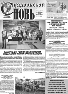 Газета основана 21 марта 1918 г. № 45 (12210) среда, 16 июня 2021 г. Общественно политическая газета Реклама ВСЕРОССИЙСКИЙ ТУРИСТИЧЕСКИЙ ФЕСТИВАЛЬ МНОГОДЕТНЫХ СЕМЕЙ «МОЯ РОССИЯ» ПРИГЛАШАЕМ К УЧАСТИЮ ЖИТЕЛЕЙ СУЗДАЛЬСКОГО РАЙОНА! В 2021 году в рамках проекта «Многодетная Россия» Фонд поддержки детей, находящихся в трудной жизненной ситуации, совместно с РОО «Объединение многодетных семей города Москвы» проводят Всероссийский туристический фестиваль многодетных семей «Моя Россия». Задача фестиваля - выявление маршрутов на территории РФ, наиболее подходящих для семейного отдыха, а также продвижение внутреннего туризма как приоритетного направления для отдыха семей с детьми. Фестиваль пройдет в период с апреля по сентябрь 2021 года. В ПРОГРАММЕ КОНКУРС «СЕМЕЙНЫЙ ТУРИЗМ» Сроки конкурса: 4 апреля - 20 августа 2021 года К участию в конкурсе приглашаются многодетные семьи и семьи с детьми. Участники присылают на конкурс эссе, сопроводительные фото-, видео- и другие мультимедийные материалы, в которых должен быть описан опыт семейного путешествия. Участникам предлагается раскрыть одну или несколько предложенных тем с детальным описанием подготовки путешествия, его маршрута, посещенных локаций, особенностей организации, полученных впечатлениях и практическом опыте. Материалы, предоставляемые на конкурс, должны быть уникальными, самостоятельно созданными участниками на основе личного опыта. КОНКУРС «СЕМЕЙНЫЙ ТУРИЗМ» среди профильных учреждений Сроки конкурса: 10 апреля - 20 августа 2021 года К участию в конкурсе приглашаются государственные и муниципальные учреждения, негосударственные некоммерческие организации и общественные объединения, коммерческие организации и созданные ими союзы (ассоциации), оказывающие поддержку семьям с детьми и многодетным семьям в организации туристического отдыха на территории Российской Федерации. Каждая заявка должна содержать подробное описание проекта, опыт его реализации, целевую аудиторию, географию, достигнутые результаты. По итогам конкурса будет выпущен атлас семейного отдыха «Моя Россия» - путеводитель для семей, путешествующих по России. В книгу будут включены полезные советы от участников конкурса, выдержки конкурсных работ с описаниями и фотографиями уникальных туристических объектов, краткие сведения об интересных семейных туристических маршрутах в разных регионах России. В сентябре 2021 года в Москве в финале туристического фестиваля гости мероприятия увидят фильм об особенностях внутреннего туризма, его актуальном состоянии и перспективах в сфере семейного отдыха. Семьи, занявшие три призовых места на конкурсе, будут приглашены для очного участия в финале и награждения. Подробная информация о Всероссийском туристическом фестивале многодетных семей «Моя Россия» размещены на сайте проекта https://многодетные-семьи. рф/turizm2021. В преддверии государственного праздника - Дня России и в рамках акции «Мы - граждане России» в администрации Суздальского района состоялось торжественное вручение паспортов юным жителям района. В торжественном мероприятии приняли участие Глава администрации района Алексей Сараев, начальник отделения по вопросам миграции ОМВД России по Суздальскому району, майор полиции Алексей Савельев, начальник управления образования администрации района Ольга Богданов