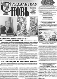 Газета основана 21 марта 1918 г. № 58 (12223) пятница, 30 июля 2021 г. Общественно политическая газета ВЫБОРЫ ДЕПУТАТОВ ГОСУДАРСТВЕННОЙ ДУМЫ ФЕДЕРАЛЬНОГО СОБРАНИЯ РОССИЙСКОЙ ФЕДЕРАЦИИ ВОСЬМОГО СОЗЫВА ИНФОРМАЦИОННОЕ СООБЩЕНИЕ Избиратель имеет право подать заявление о включении в список избирателей по месту нахождения на выборах депутатов Государственной Думы Федерального Собрания Российской Федерации восьмого созыва. Заявление может быть подано избирателем лично при предъявлении паспорта гражданина Российской Федерации в пункт приема заявлений: территориальные избирательные комиссии Владимирской области: со 2 августа по 13 сентября 2021 года в рабочие дни с 10.00 до 12.00 и с 13.00 до 21.00, в выходные дни с 9.00 до 15.00; участковые избирательные комиссии Владимирской области: с 8 по 13 сентября 2021 года в рабочие дни с 17.00 до 21.00, в выходные дни с 9.00 до 15.00; многофункциональные центры предоставления государственных и муниципальных услуг: со 2 августа по 13 сентября 2021 года по графику работы МФЦ. Заявление может быть подано в электронном виде через Единый портал государственных и муниципальных услуг в период со 2 августа по 13 сентября 2021 года (не позднее 24.00 по московскому времени). В канун 1 сентября 2021-2022 учебного года ГБУСО ВО «Комплексный центр социального обслуживания населения Суздальского района» просит вас принять участие в ежегодной благотворительной акции «Соберем портфель вместе» по сбору школьных принадлежностей для малообеспеченных, многодетных семей, семей с детьми-инвалидами, учащихся в образовательных учреждениях Суздальского района. Многие ребята в этом году пойдут в первый класс, но, к сожалению, не всем родителям под силу обеспечить своих детей школьными принадлежностями самостоятельно. Все, что нужно для участия в акции – это оказание помощи любыми канцтоварами в любом количестве: карандаши, ручки, фломастеры, краски, тетради, обложки, клей, цветная бумага, ножницы и другие школьные принадлежности . Пусть этот год для первоклашек будет полон сбывшихся надежд, исполнения желаний, достигнутых целей и приятных открытий! Акция действует с 26 июля по 23 августа 2021 года. В преддверии Дня знаний все собранные подарки будут переданы нуждающимся детям. Приём гуманитарной помощи осуществляется в кабинете № 11 администрации г.Суздаля ( с 8.00 до 12.00), а так же по адресу: п.Новый, ул.Центральная, д.18 (с 8.00 до 16.15). Просим вас присоединиться и подарить радость детям в новом учебном году! ЗАРАНЕЕ ВЫРАЖАЕМ ВСЕМ ЗА ЭТО БЛАГОДАРНОСТЬ! Уважаемые жители города Суздаля и Суздальского района! По официальным данным общественной организации «Союз Чернобыль» в ликвидации последствий аварии на атомном реакторе принимало участие 2717 жителей Владимирской области. Более трети «чернобыльцев» уже ушло из жизни. В качестве благодарности за подвиг государство установило для ликвидаторов ряд льгот. Одна из них касается коммунальных платежей. Тем, кто пострадал от радиации в Чернобыльской катастрофе, полагается компенсация половины расходов на квартплату. Однако, мера распространяется только на приватизированное жилье – тех, кто квартиру купил или получил в наследство, она не касается. «К нам постоянно поступают такие обращения. Когда принимали закон, на верху, видимо решили: раз есть деньги на квартиру, значит, богатый, льготы ему не нужны. Но это несправедливо. К т
