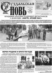 Газета основана 21 марта 1918 г. № 59 (12224) среда, 4 августа 2021 г. Общественно политическая газета Реклама Крылатая пехота – это безупречная выучка и стойкость, готовность к выполнению самых сложных задач. «Многие наши земляки прошли серьезную школу в Воздушно-десантных войсках. Годы службы они вспоминают, как лучшее время в своей жизни. Сейчас ветераны ВДВ вносят неоценимый вклад в патриотическое воспитание молодежи, активно принимают участие в общественной жизни региона», - говорит Владимир Киселёв. В День ВДВ ему, как ветерану-десантнику, торжественно вручили медаль генерал-лейтенанта Глазунова. Дважды Герой Советского Союза генерал-лейтенант Василий Глазунов – первый командующий Воздушно-десантных войск страны. Его называют «десантным дедом». Специально для награждения на еженедельное рабочее совещание в Законодательное Собрание приехал спецпредставитель командующего ВДВ и лично вручил медаль Владимиру Киселёву. Спикер ЗС тепло поблагодарил за оказанную честь и пожелал воинам-десантникам крепкого здоровья, счастья, благополучия, новых успехов на службе: «Крепости сил душевных и физических. Никто, кроме нас! Слава ВДВ!», - поздравил Владимир Киселев «голубые береты». Для справки: 2 августа 1930 года на учениях Московского военного округа впервые было применено парашютное десантирование личного состава. Именно эту дату принято считать днём рождения Воздушно-десантных войск. Пресс-служба ЗС области. ВЛАДИМИР КИСЕЛЁВ ПОЗДРАВИЛ ДЕСАНТНИКОВ С ДНЕМ ВДВ: «НИКТО, КРОМЕ НАС!» 2 августа отметили 91-ю годовщину образования Воздушно-десантных войск. По традиции, председатель Законодательного Собрания области Владимир Киселёв возложил цветы к монументу «Скорбящие ангелы». Как ветерану ВДВ ему вручили медаль «крылатой пехоты». Сильные, надежные, бесстрашные, преданные долгу и Отечеству воины - владимирские «голубые береты» собираются 2 августа у монумента «Скорбящие ангелы». Как и всегда, в этом году к ним присоединился Владимир Киселёв, сам в прошлом десантник. Владимир Киселёв у монумента «Скорбящие ангелы». Многие наши земляки прошли серьезную школу в ВДВ. Окончив в родном городе Владимирский авиамеханический техникум, Алексей Владимирович Тонкачеев твёрдо для себя решил, что посвятит свою жизнь защите Родины от всякой нечисти. Не секрет, что многие призывники побаиваются попасть в Воздушно-десантные войска (ВДВ), а А.В. Тонкачеев, оказавшись на призывном пункте, всё сделал, чтобы в них и оказаться. Трудности службы перенёс с честью. И закалив характер и убеждения – всё лучшее перенёс на свою работу в суздальской милиции. Своим жизненным принципам Алексей Владимирович остаётся верен до сих пор. Службу свою А.В. Тонкачеев начал оперативным уполномоченным уголовного розыска. С этим подразделением ОМВД России по Суздальскому району он связан более 27 лет. Сейчас Алексей Владимирович является заместителем начальника полиции ОМВД России по Суздальскому району, подполковник полиции возглавляет весь оперативный блок отдела. А.В. Тонкачеев никогда не стремился к карьерному росту, а все усилия прилагал к раскрытию преступлений. Его человеческие качества и организаторские способности позволили создать крепкий, высоко работоспособный коллектив профессионалов. Деятельность А.В. Тонкачеева по заслугам оценена. Он награждён государ